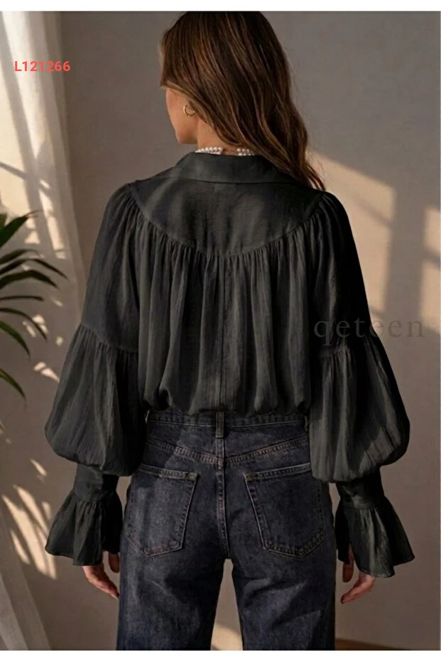 بلوزة رومانسية سوداء بأكمام بالون مزينة ومبتكرة من كيتين