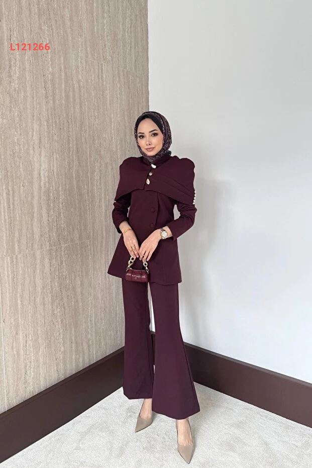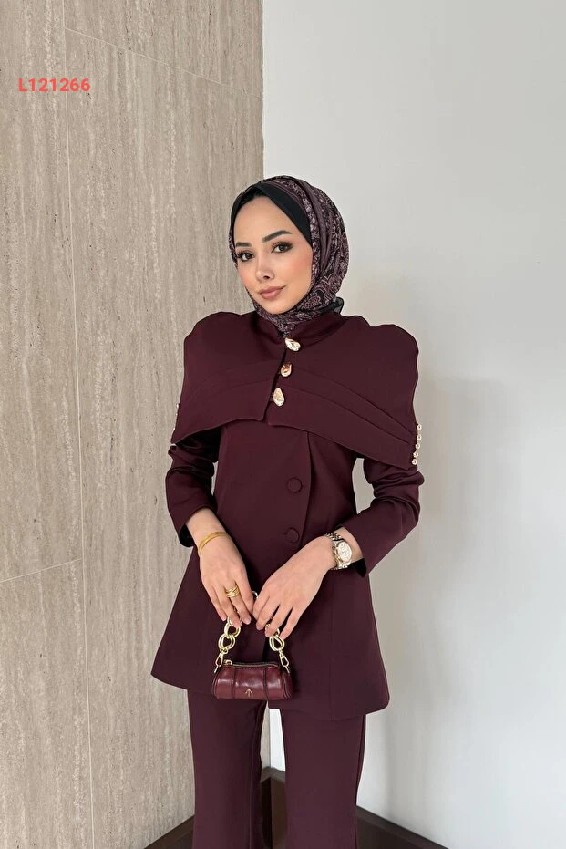 تألقي بأناقتك مع طقم QUQA المكون من سترة وبنطال باللون bordo الجذاب. يتميز التصميم العصري بتفاصيل دقيقة وراحة مثالية، مما يجعله الخيار المثالي لمناسباتك الخاصة أو لمظهر يومي أنيق. اجعلي كل نظرة إليك تتحدث عن ذوقك الراقي وثقتك بنفسك.