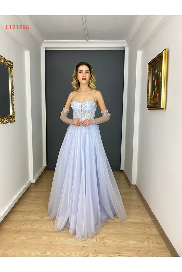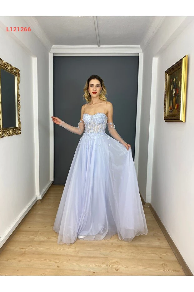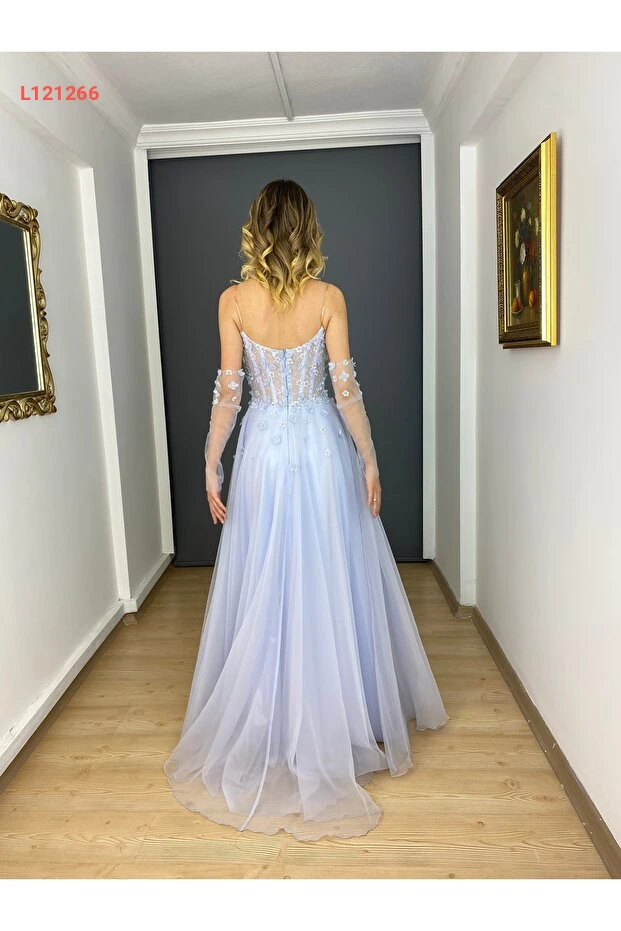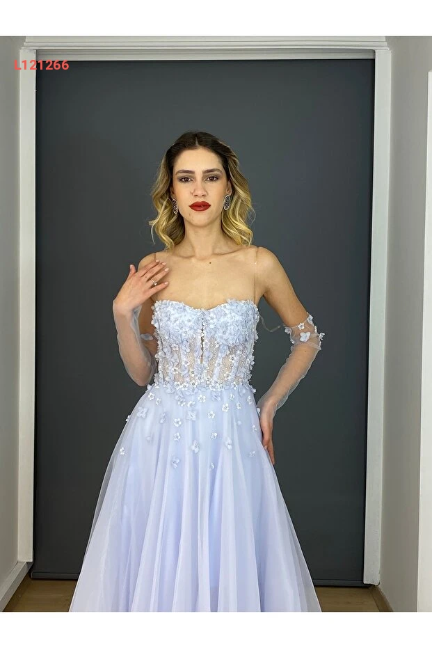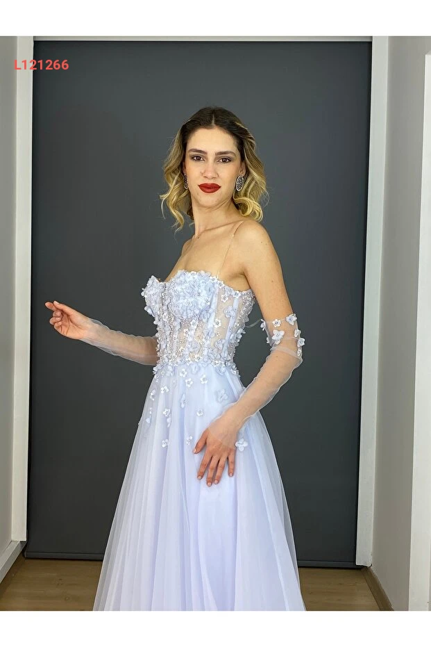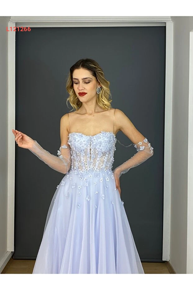 اكتشفي سحر الأناقة مع فستان "gökkuşagı moda" الأزرق الجليدي، المزود بتفاصيل زهور مطرزة تضفي لمسة رومانسية فريدة. تصميمه بدون حمالات يبرز جمال قوامك، مما يجعله الخيار المثالي للمناسبات الخاصة، حيث ستتألقين بثقة وجاذبية لا تضاهى.