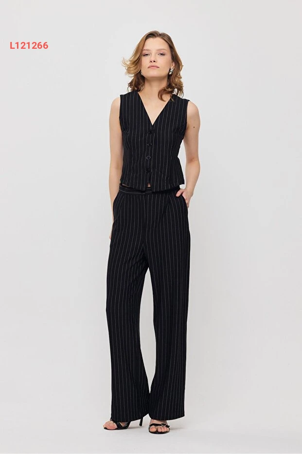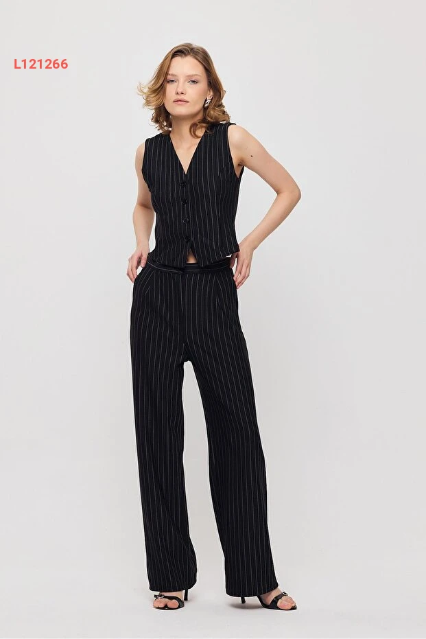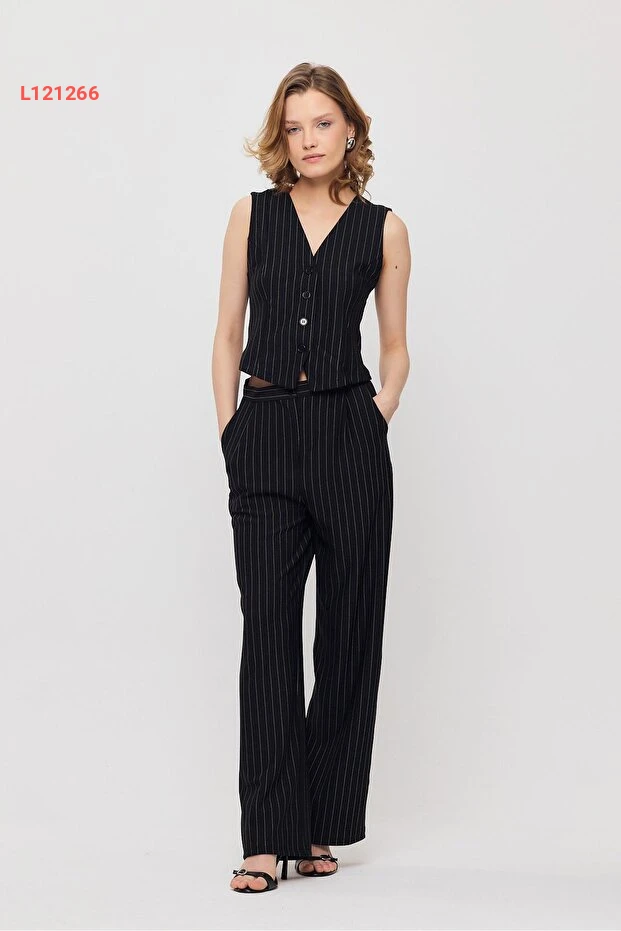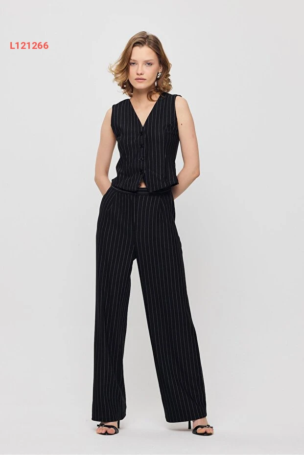 استمتع بالأناقة الراقية مع طقم البناطيل والسترة المصنوعة من القماش المضلع من Rays. تتميز السترة بأزرار أنيقة وتصميم خطي يمنحك إطلالة عصرية وفريدة، بينما توفر البنطال راحة استثنائية وأناقة تناسب مختلف المناسبات. اجعلي يومك مميزًا مع هذا الطقم الأسود الذي يعكس الرقي والتميز في كل التفاصيل.