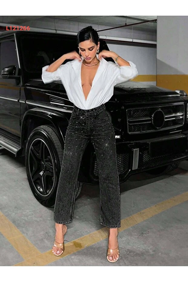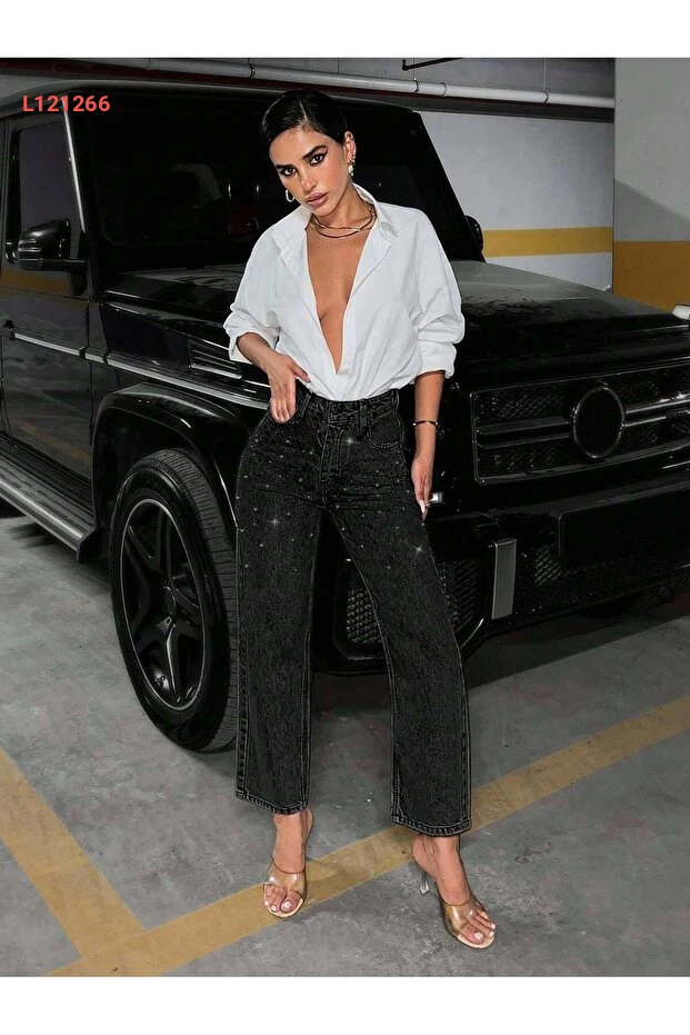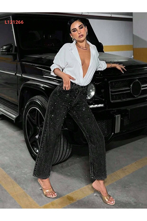 بنطلون نسائي أنيق باللون الأسود العادي مع تفاصيل جواهر من REDZARRAM