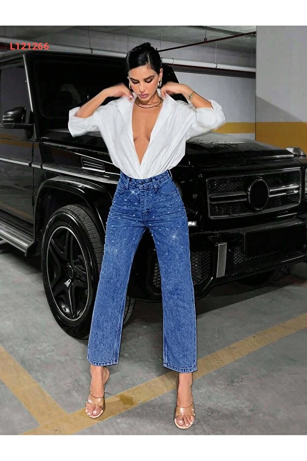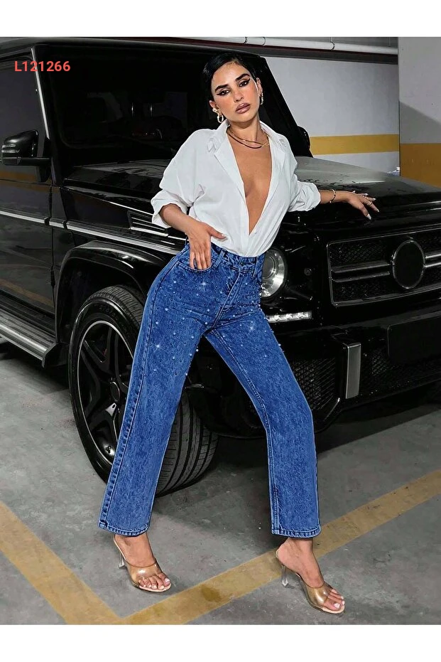 بنطال نسائي أنيق مزين بالأحجار من REDZARRAM بلون أزرق بخصر عادي