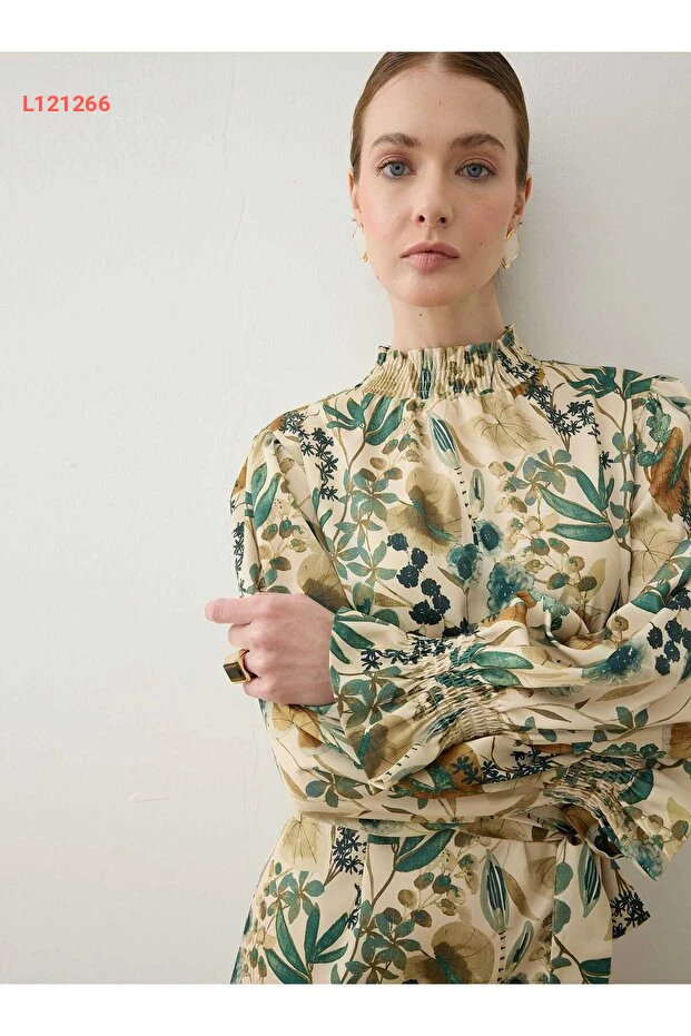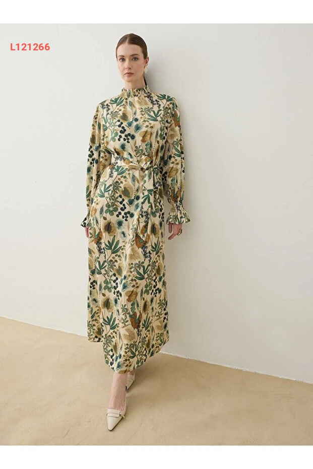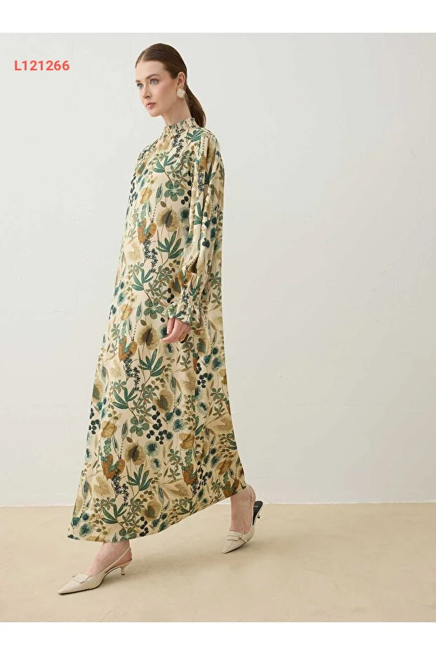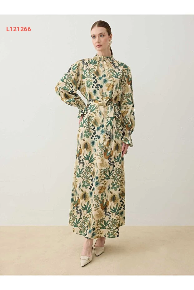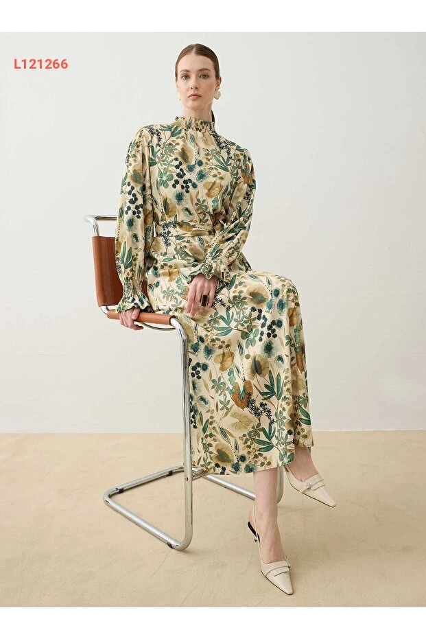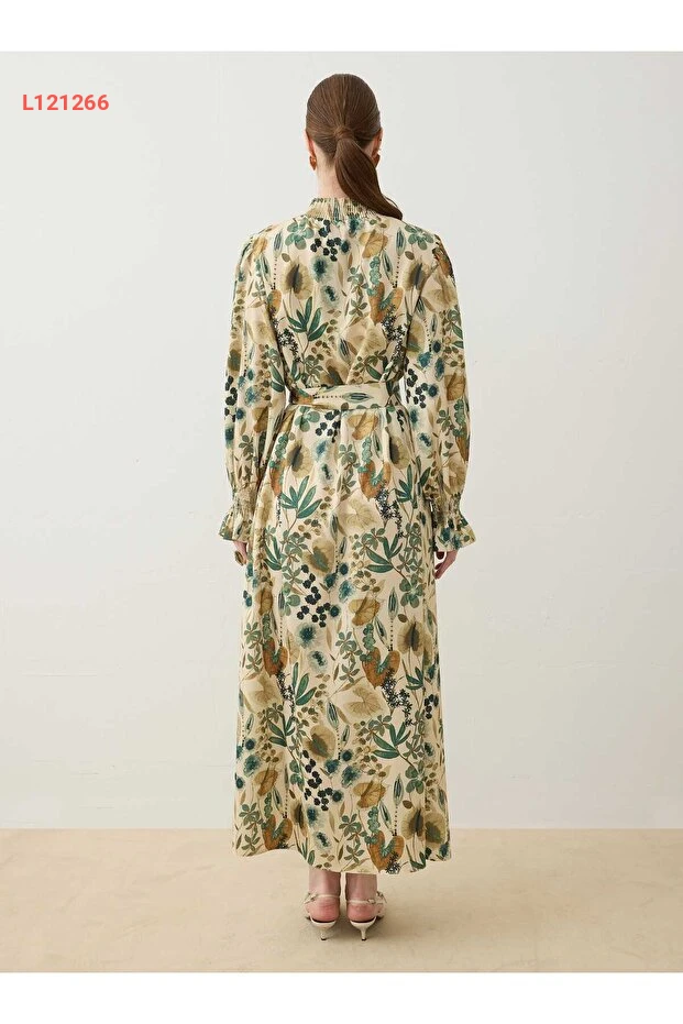 فستان مزين بنقوش الأزهار وياقة مطاطية - تصميم أوراق