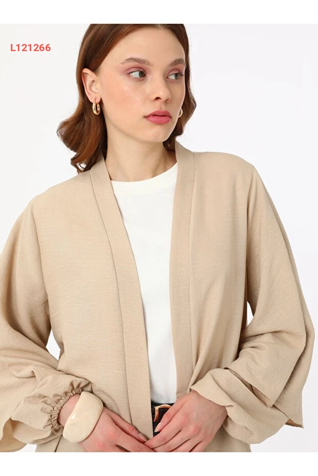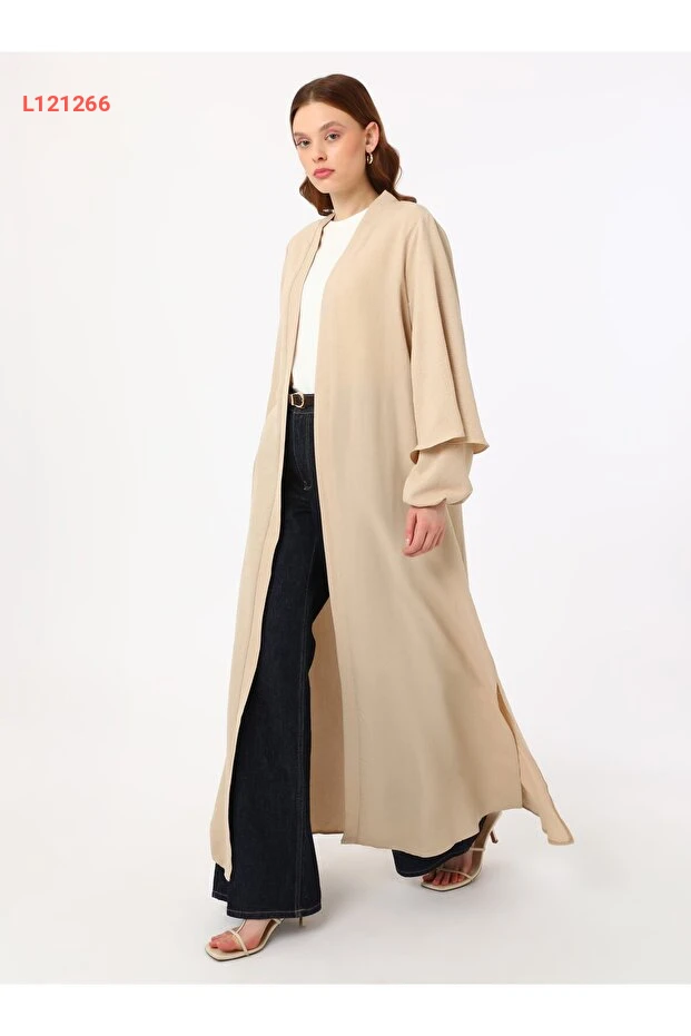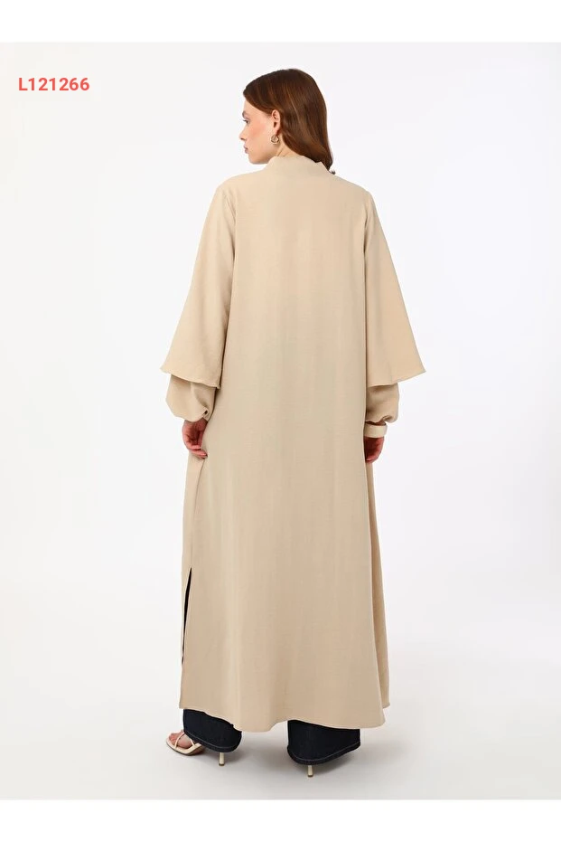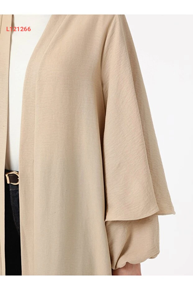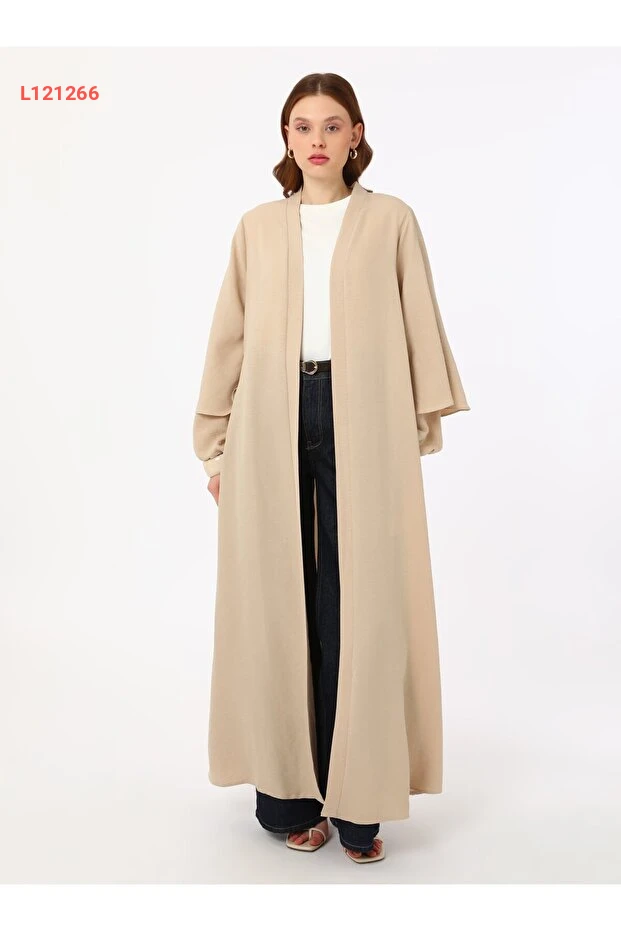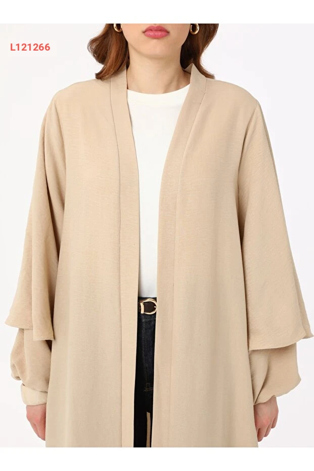 عباية طويلة بتفاصيل كشكش من قماش ايرو بيني - لون رمل بيج - رفكة