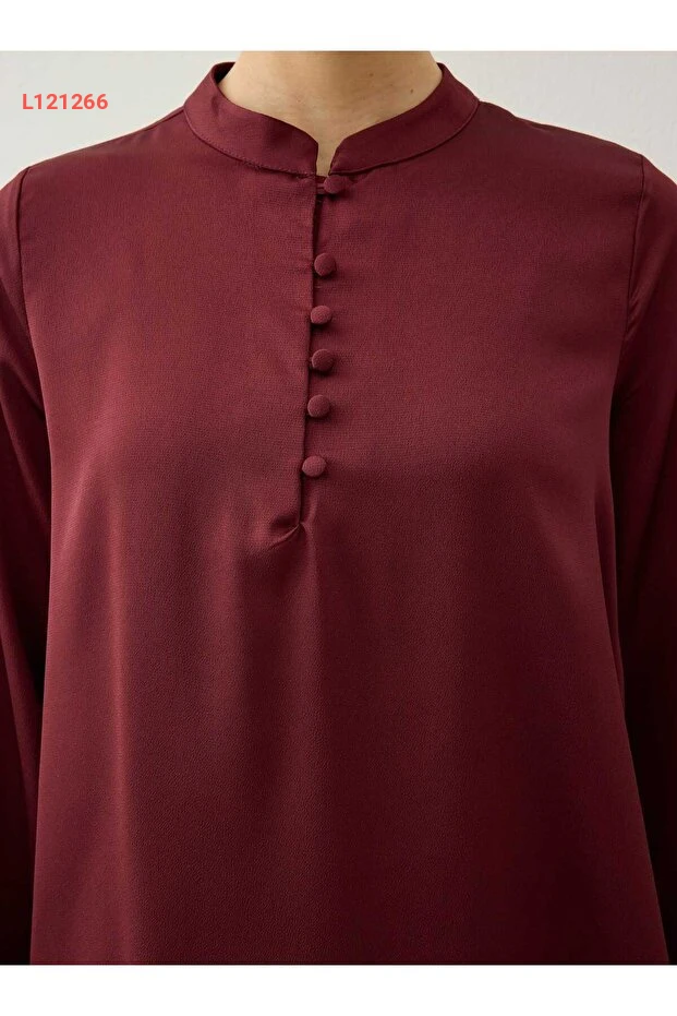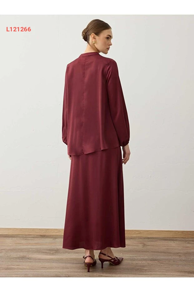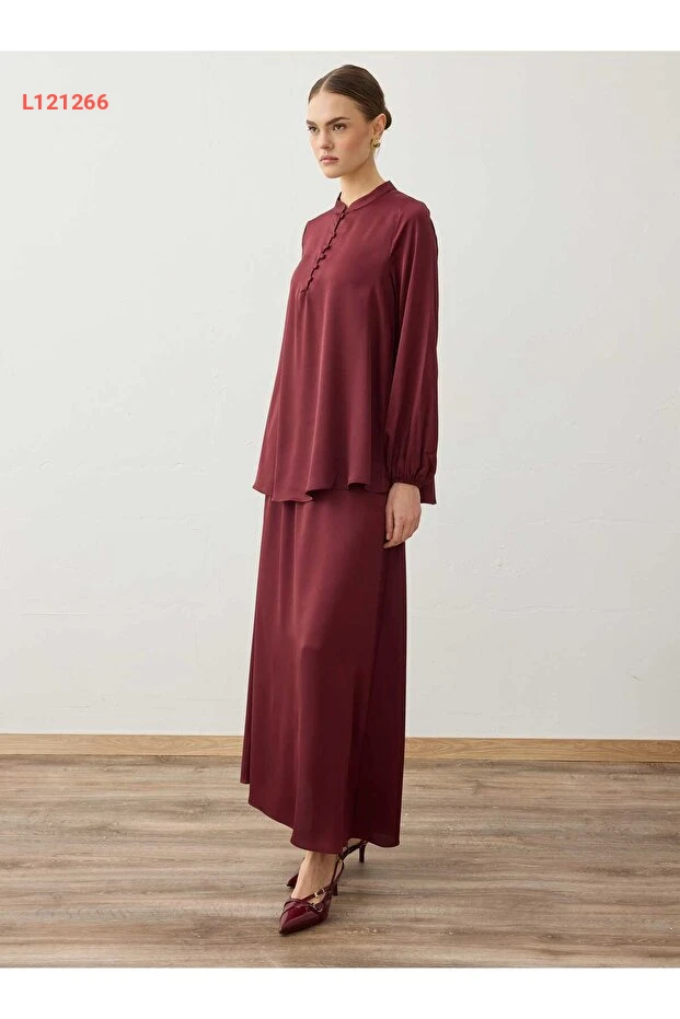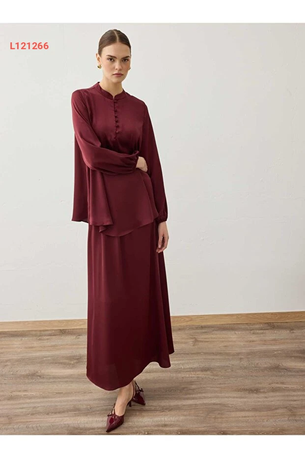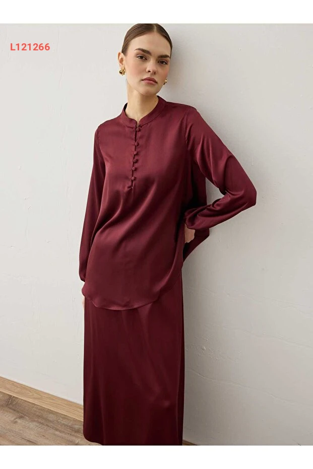 استمتعي بأناقتكِ مع طقم التونيك والتنورة من القماش الساتان الناعم الداكن باللون الأحمر، الذي يعكس لمسة من الرقي والفخامة. التصميم المميز بأزرار البريت يضيف لمسة عصرية، بينما يوفر القماش المرن الراحة والحرية في الحركة، مما يجعله خيارًا مثاليًا لإطلالة مميزة في مختلف المناسبات.