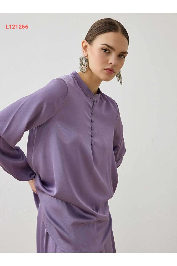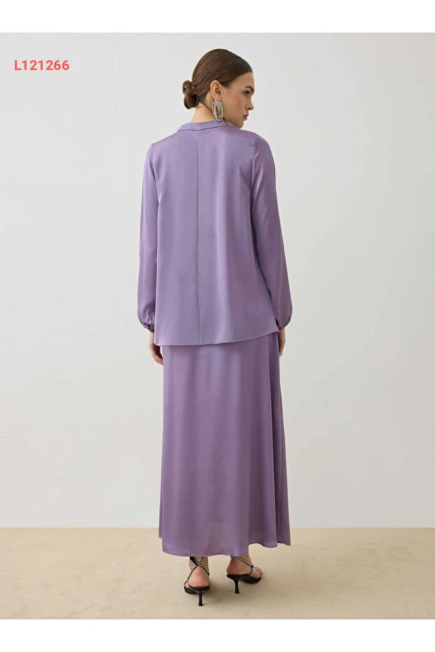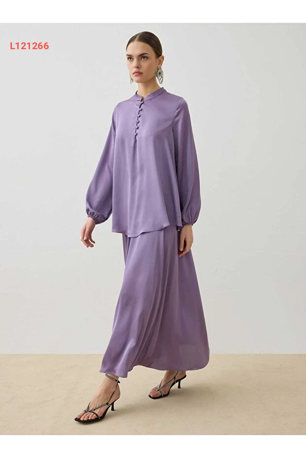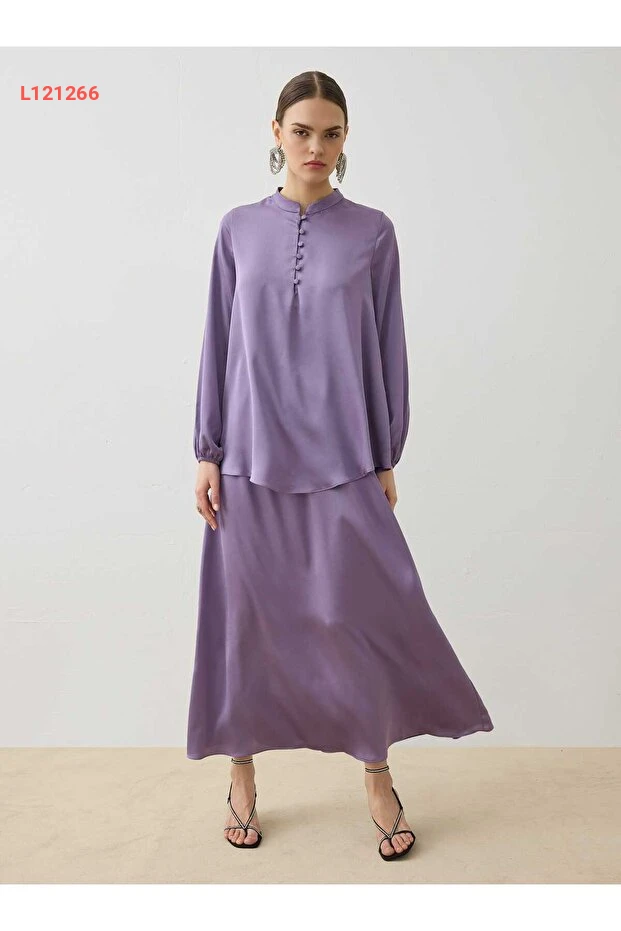 تشكيلة تنورة وقميص مزين بزر بإسورة ساتان - لون بنفسجي
