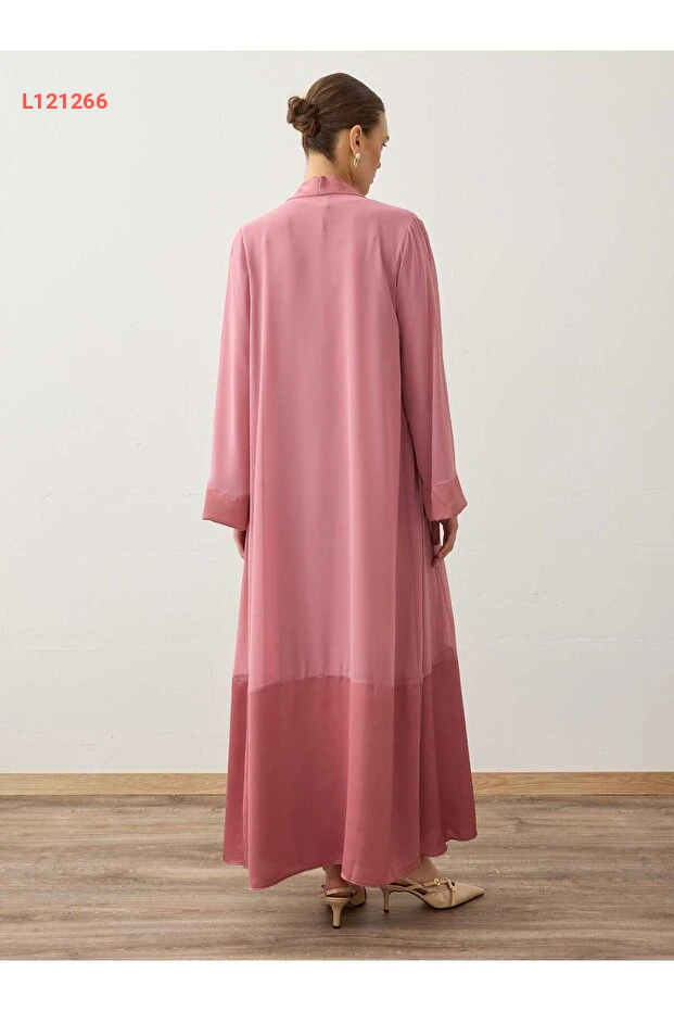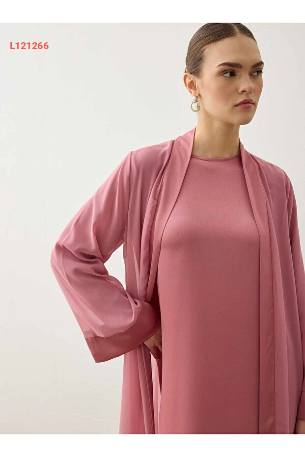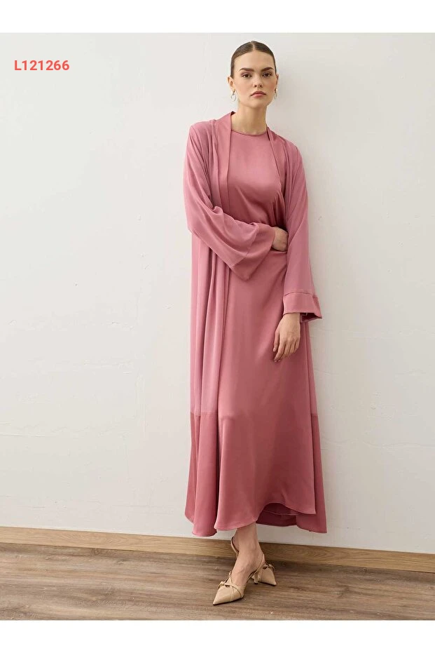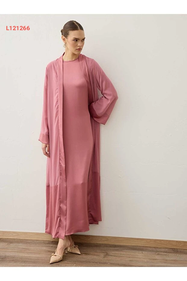 فستان وعباءة ريحانة بكم طويل من قماش ساتان - لون وردي داكن