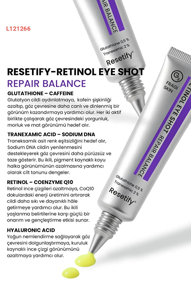 اكتشفوا تأثيرات القوة المذهلة مع كريم عين RESETIFY Retinol Eye Shot. يضم تركيبة فريدة تحتوي على 0.1% ريتينول و2% ترانكساميك و0.5% جلاوتاثيون، مما يساعد على تقليل التجاعيد والهالات السوداء، وإضاءة منطقة العين لتحصلوا على مظهر شبابي ومشرق. طبّقوه يوميًا لتستمتعوا بعناية فعّالة ونتائج مرئية.