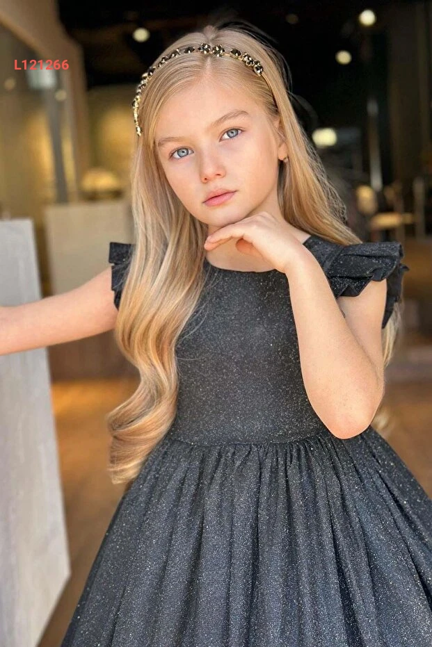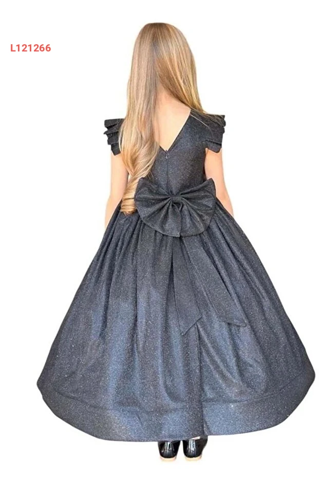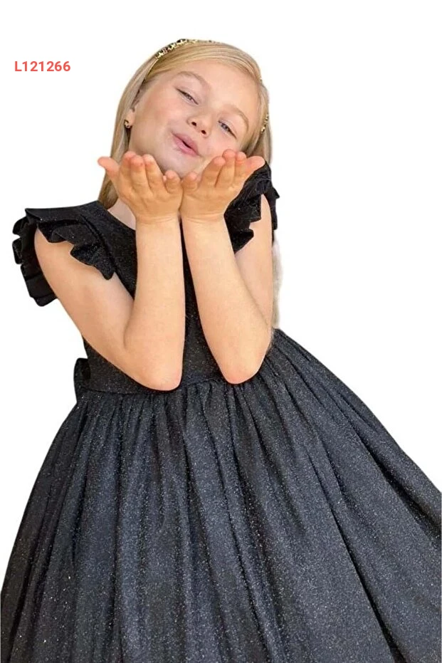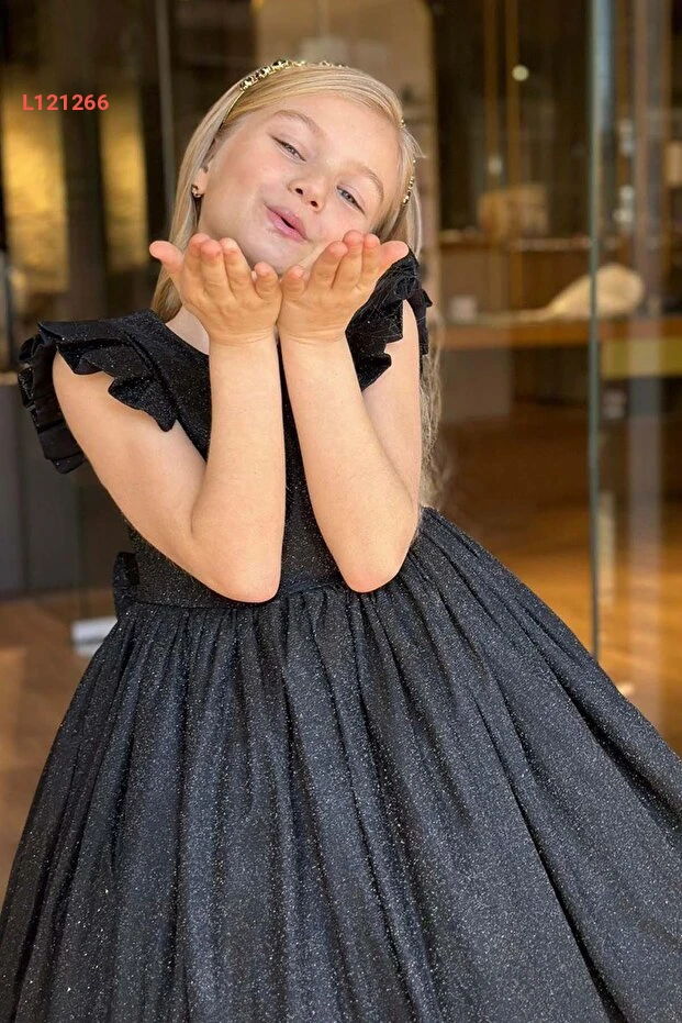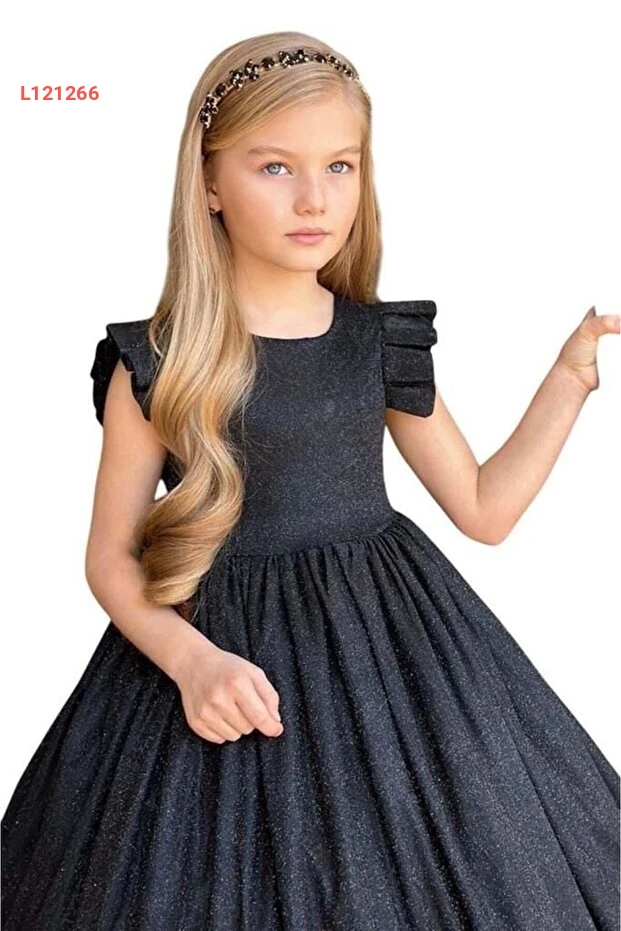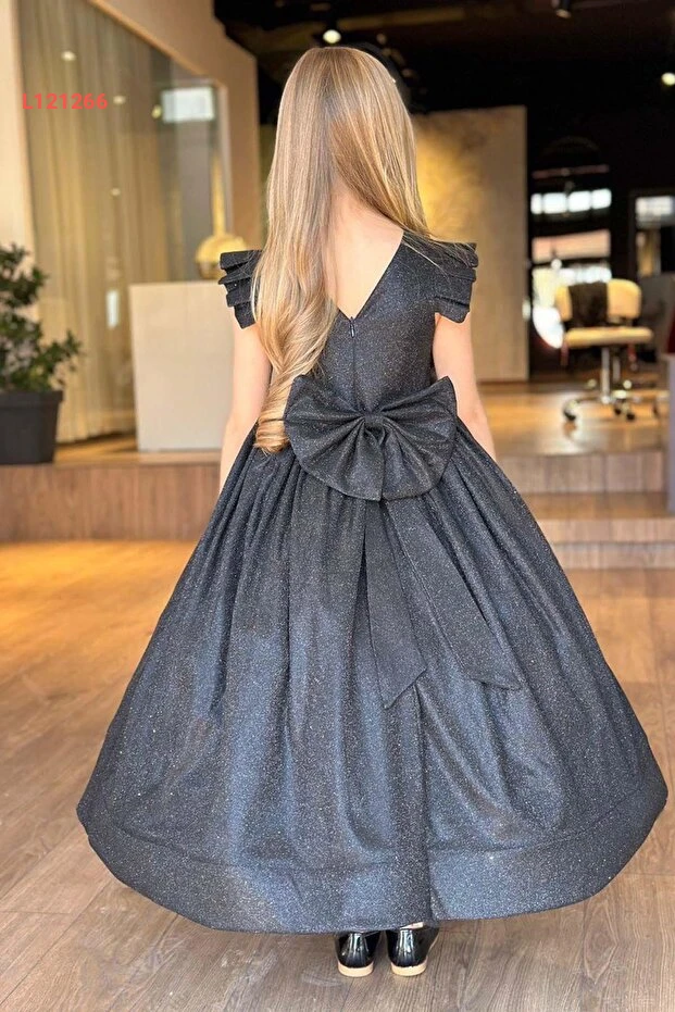 فستان سهرة أسود للأطفال مزين باللمعان مع تفاصيل من الفراشات على الأكتاف
