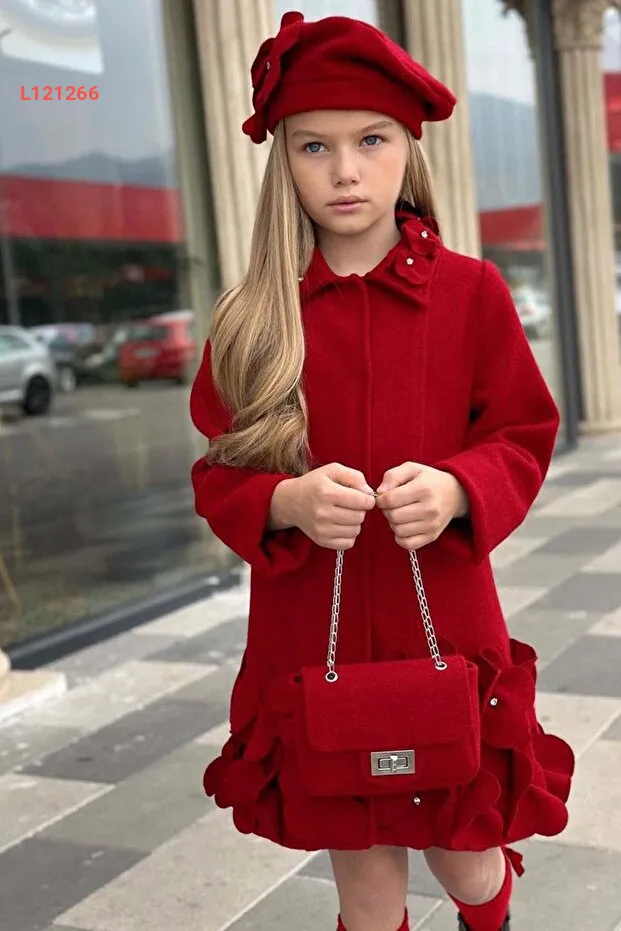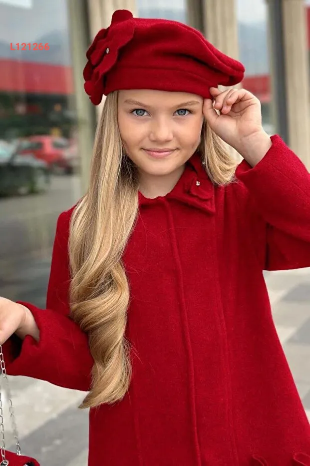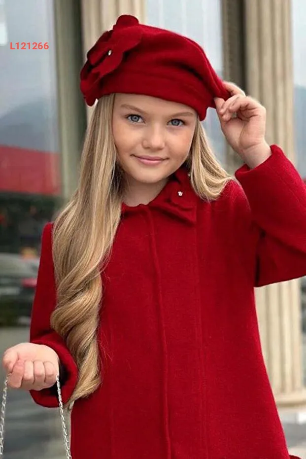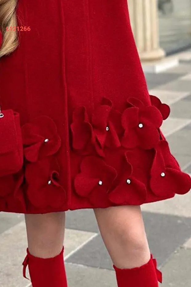 جاكيت أطفال بناتي أحمر مزين بحجارة وتفاصيل البرسيم مع أزرار ضغط