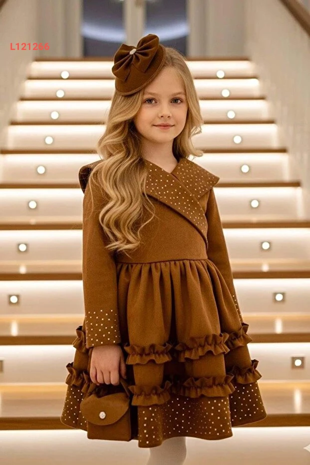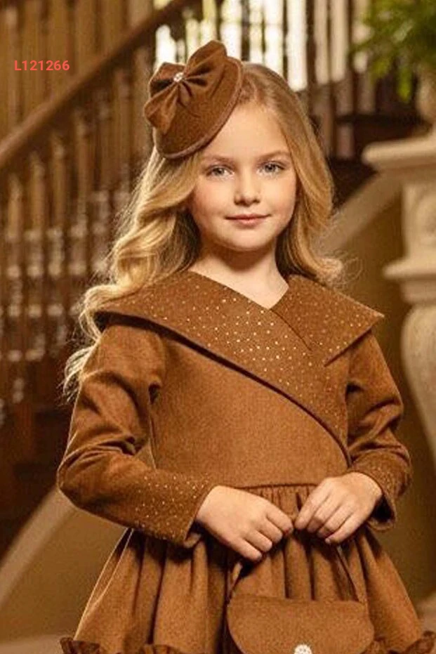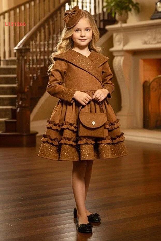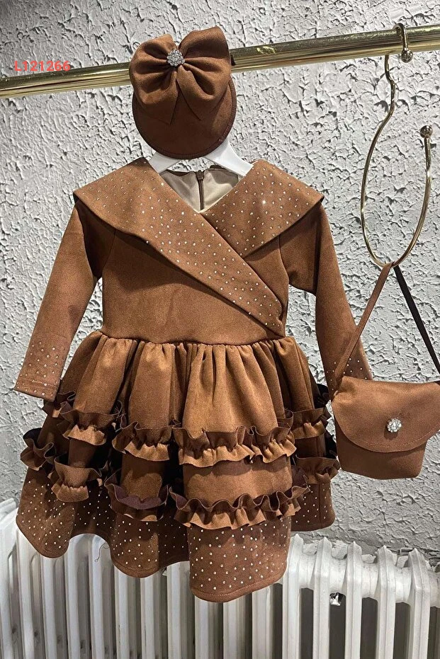 فستان سويدي للأطفال بنات بتفاصيل متلألئة وياقة على شكل حرف V وأطراف مزخرفة بلون الكاكاو