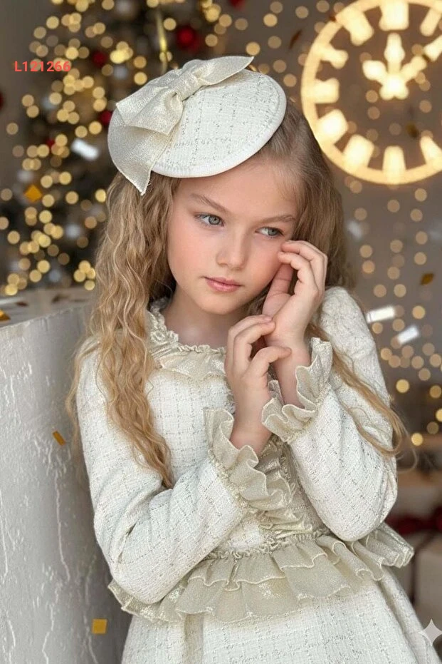 فستان شانيه ذهبي مزين بكشكش لعمر الطفل مع تصميم مربع