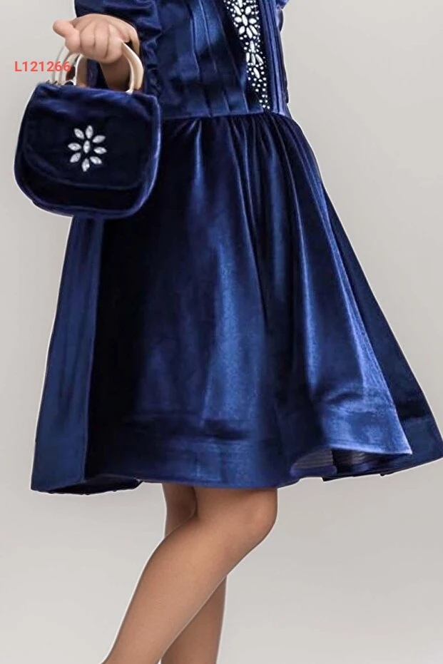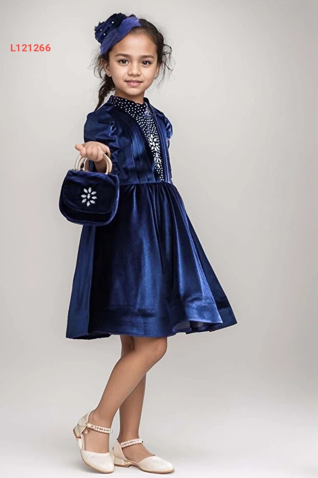 استمتع بإطلالة ساحرة مع فستان Riccotarz من قماش المخمل الأزرق الداكن، المزين بتفاصيل الزهور الراقية والأحجار اللامعة. تتمتع ياقة الفستان العالية بتصميم أنيق يجمع بين الأنوثة والفخامة، مما يجعله الخيار المثالي للمناسبات الخاصة والعزائم. مثالي لكل فتاة ترغب في التألق والتميُّز!