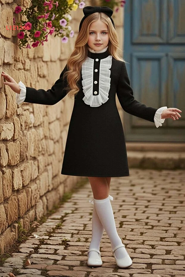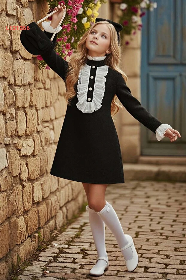 فستان شانون الأسود لتفاصيل الدانتيل وزركشة الفتيات مع ياقة الفيلسوف