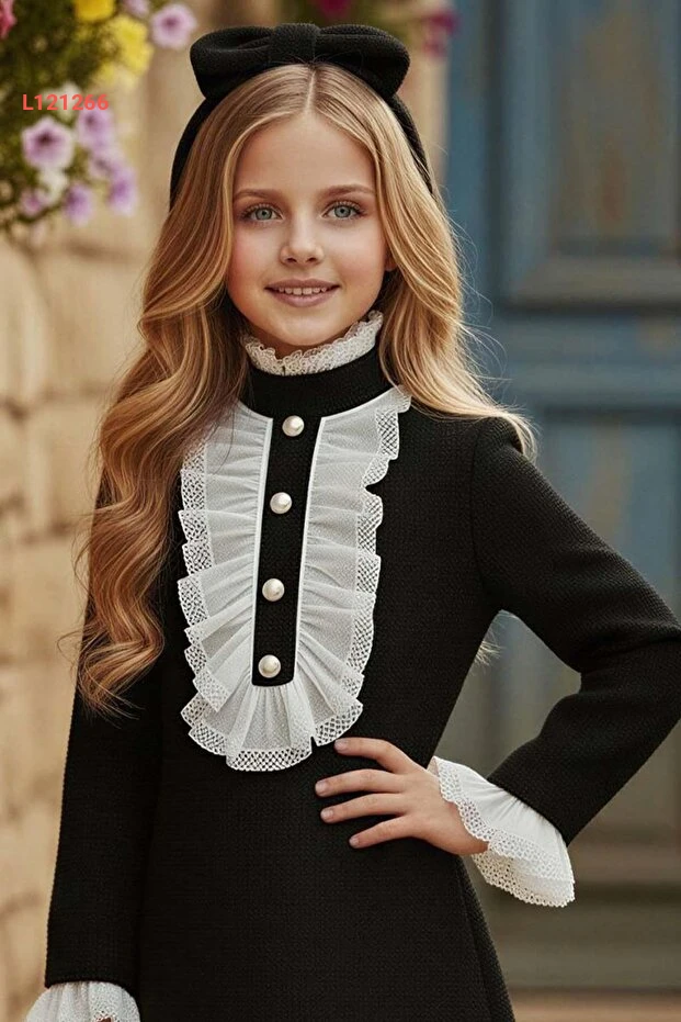 تألقي بالجميلة مع فستان Riccotarz الأسود المزين بالدانتيل والتفاصيل الجذابة! يتميز برقبة بالياشو الرائعة والتفاصيل الفرفورية التي تضيف لمسة من الأناقة، مما يجعل هذا الفستان خيارًا مثاليًا لمناسبات الأطفال. يمنح راحتها وانطلاقها حرية الحركة مع الحفاظ على أناقتها الباهرة!