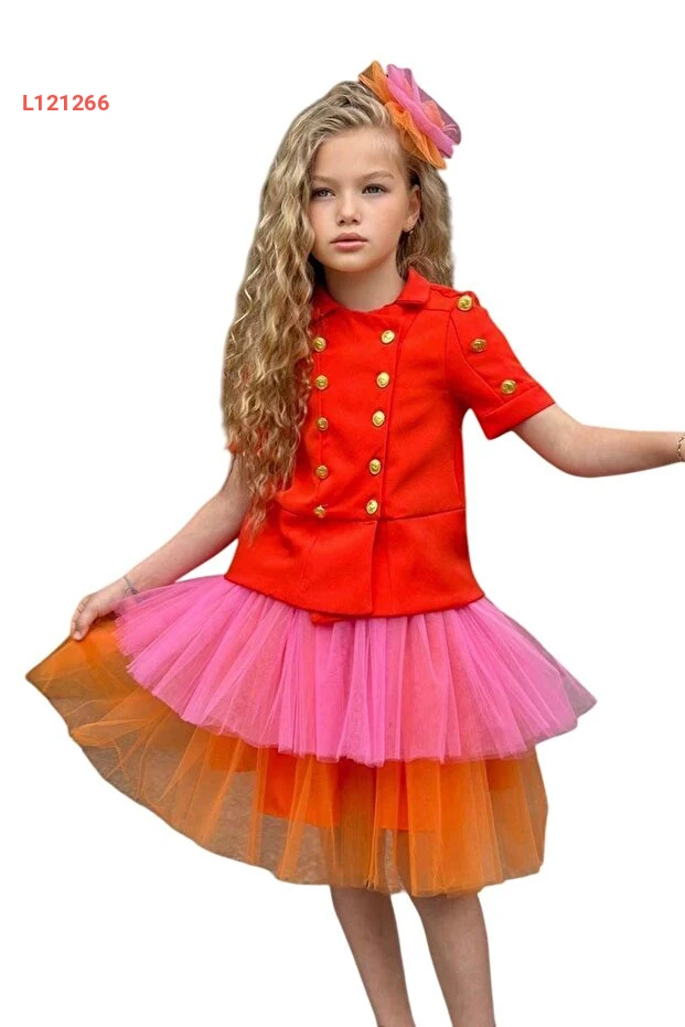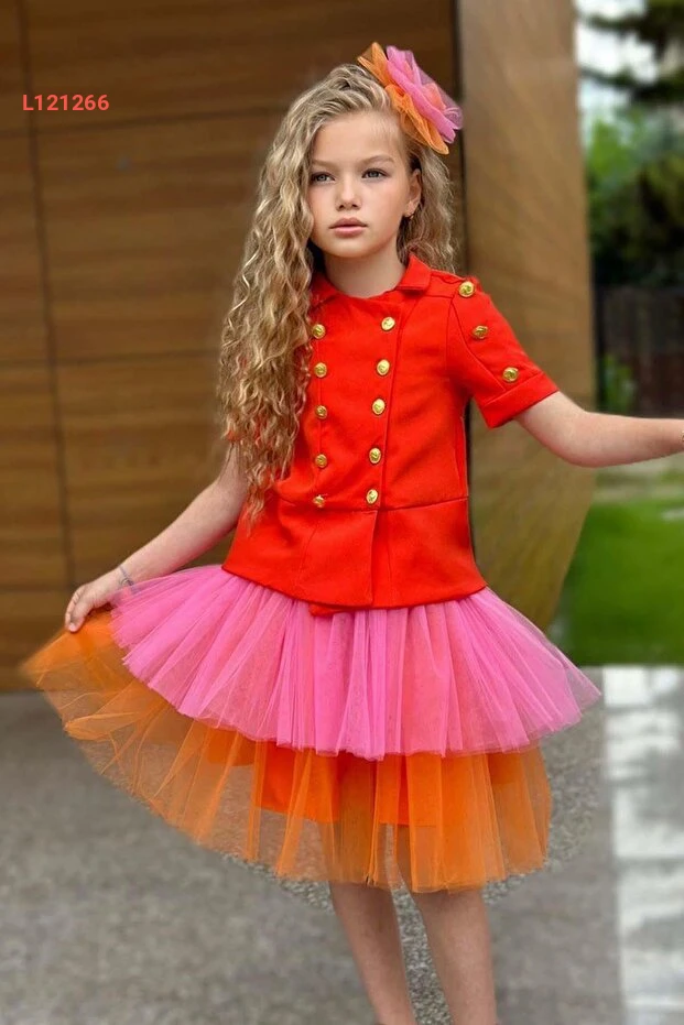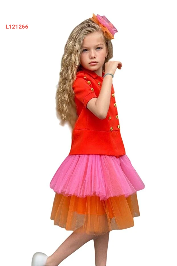 استمتعي بأناقة لا مثيل لها مع طقم "Riccotarz" لجيل البنات، الذي يضم قميصًا مزينًا بأزرار ذهبية أنيقة مع تنورة ثنائية اللون البرتقالي. مثالي للتجمعات والمناسبات، يجمع هذا الطقم بين الراحة والموضة ليمنح صغيرتك مظهرًا رائعًا ومتميزًا. أضيفي لمسة من البهجة إلى خزانة ملابسها بهذا التصميم العصري الجذاب!