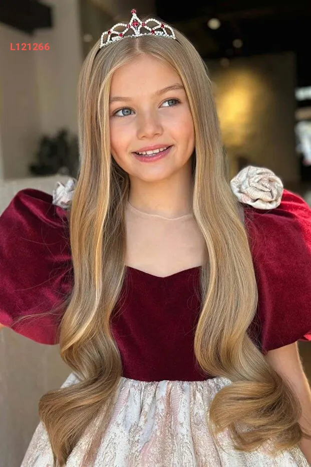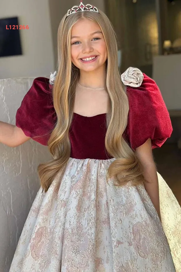 فستان سهرة طويل بوردو ذو أكمام منتفخة بتفاصيل ورود للبنات من ريكوتارز