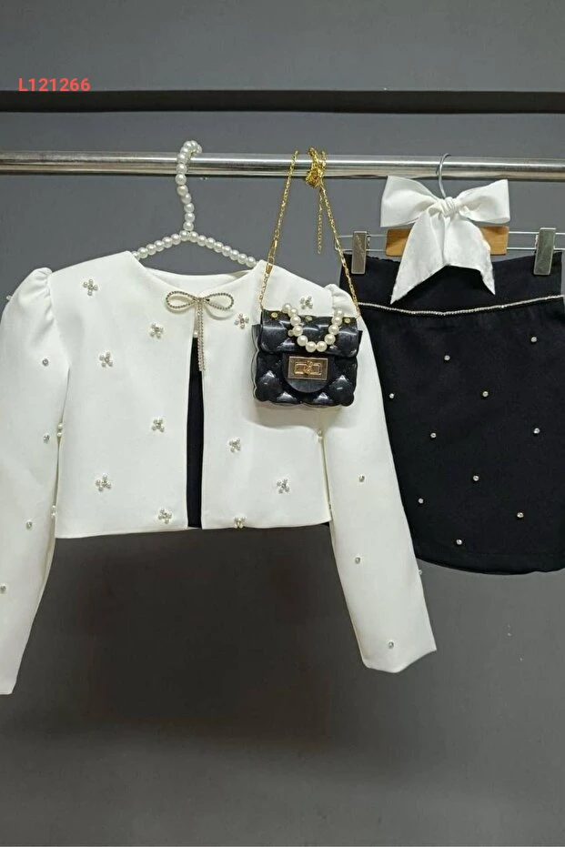 طقم فستان للبنات مع بلوزة مزخرفة بالأحجار وسترة بيضاء