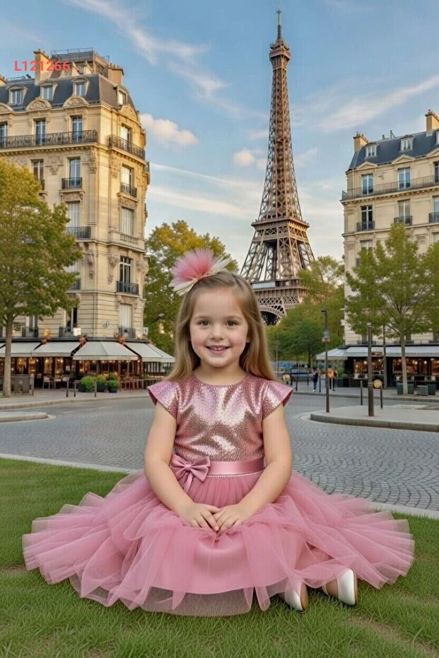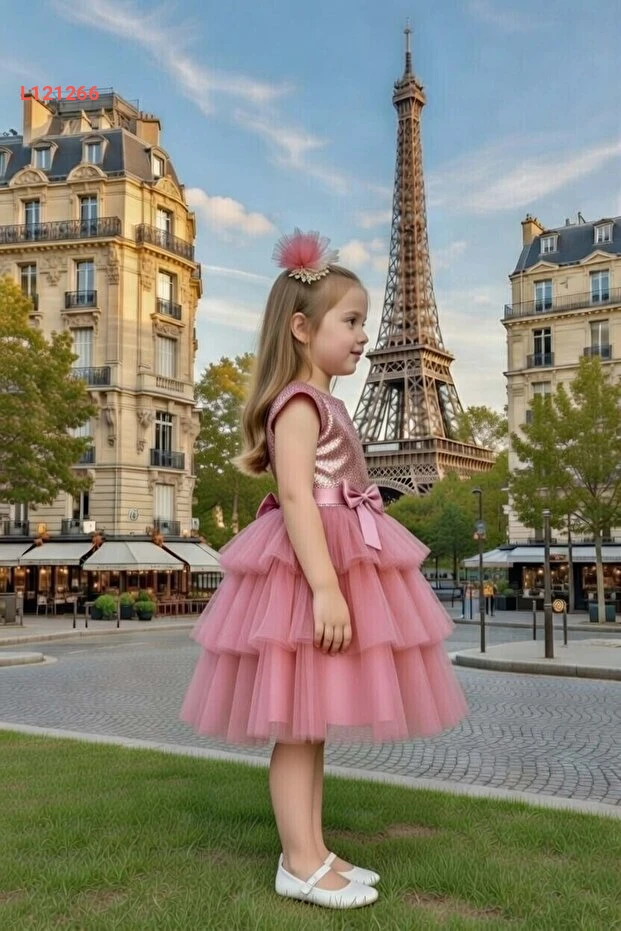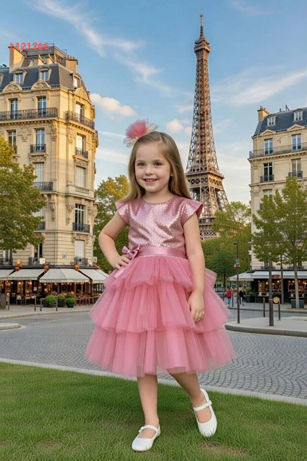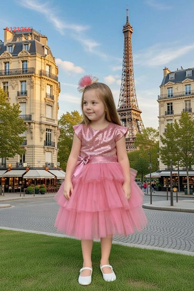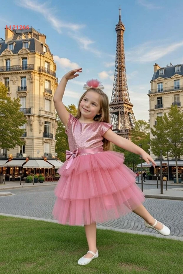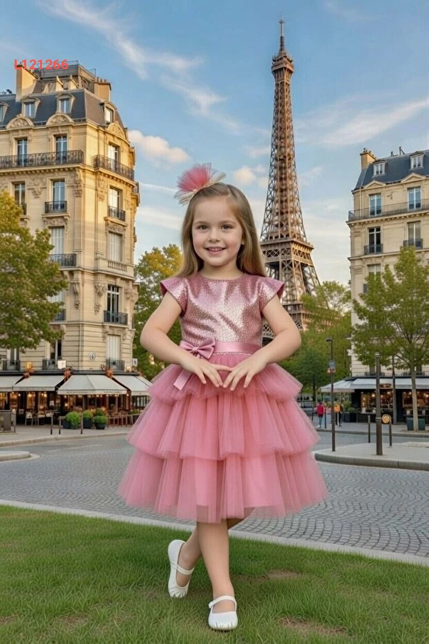 فستان سهرة طبقات تولو للأطفال من ريكوتارز - لون وردي غامق مع تطريز جذاب