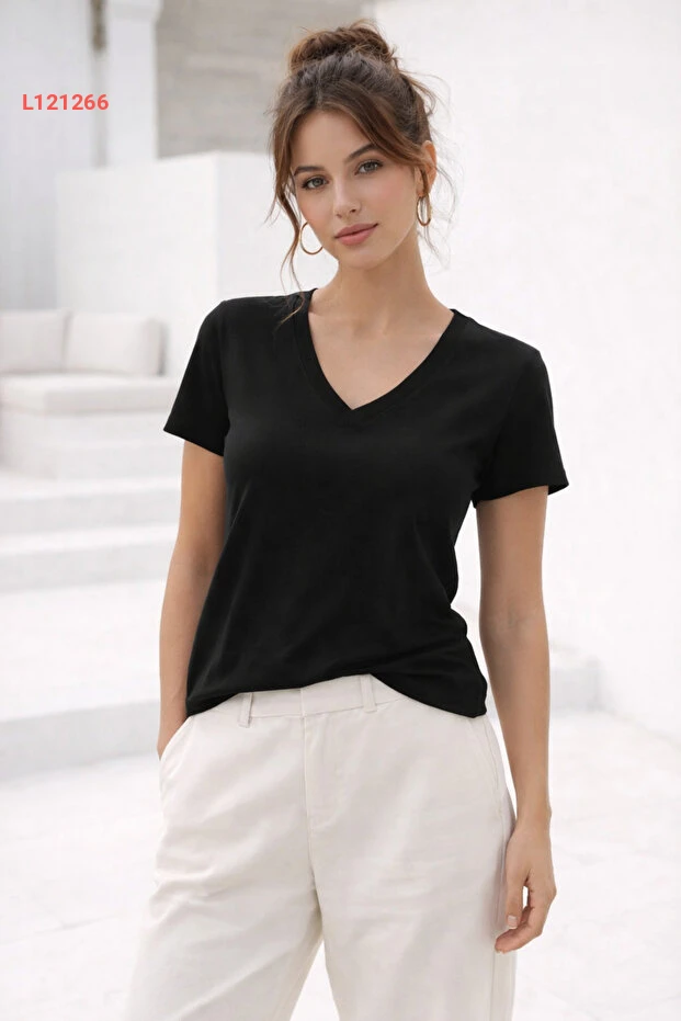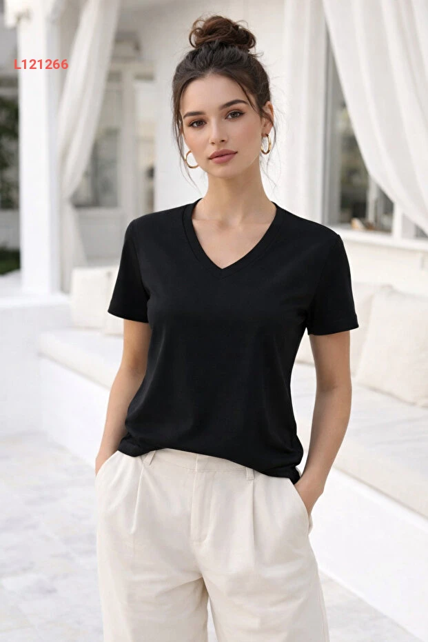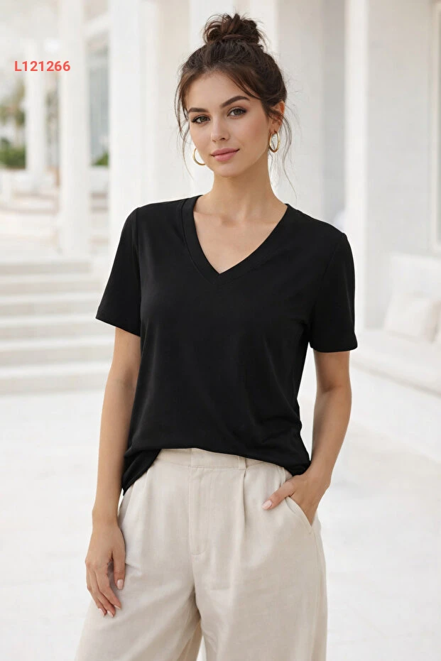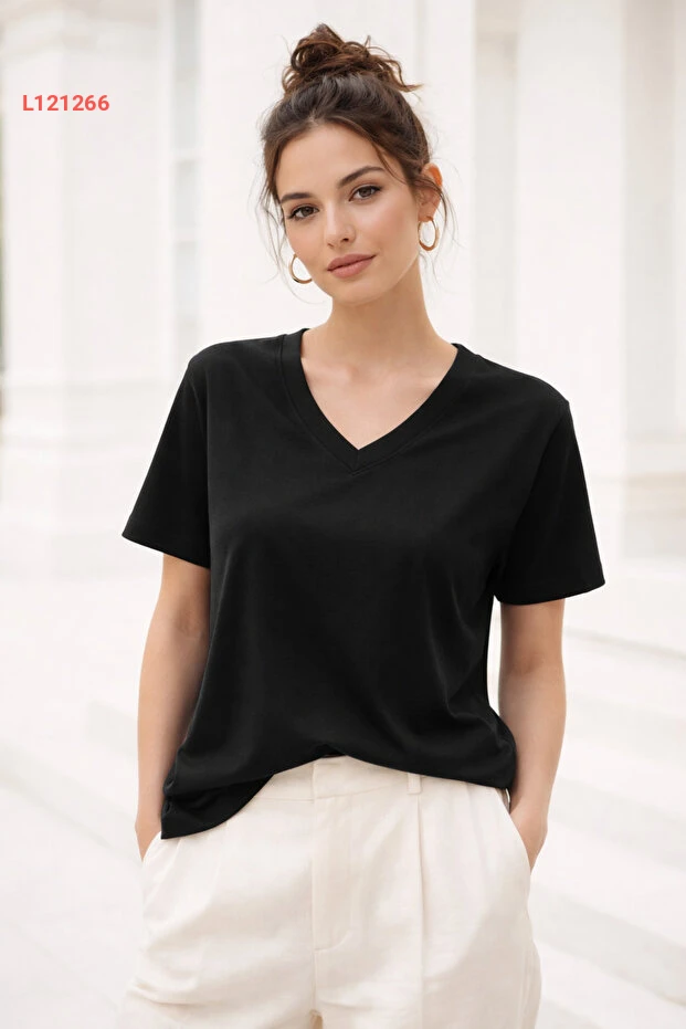 تي شيرت أساسي بتصميم على شكل حرف V من قماش ناعم باللون الأسود للنساء