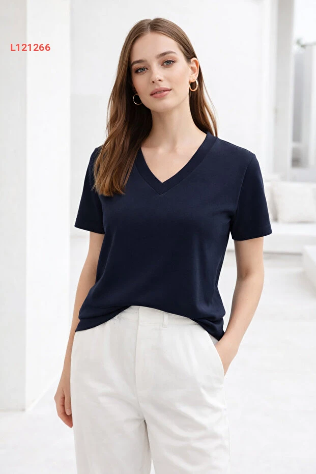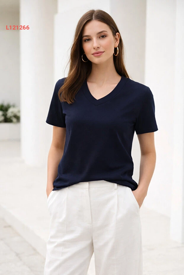 تي شيرت أساسي قطن ناعم بياقة V باللون الأزرق الداكن من ريتش