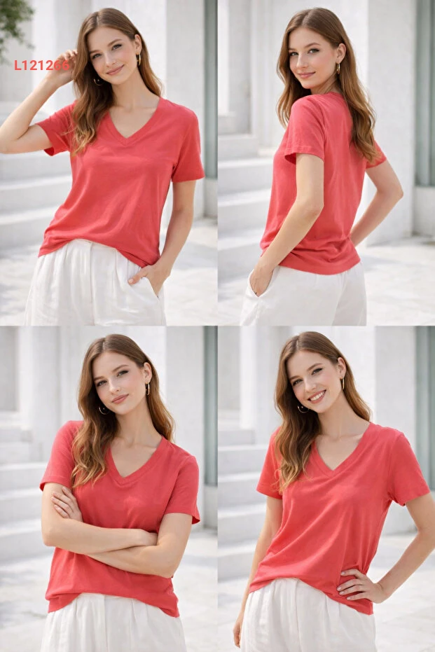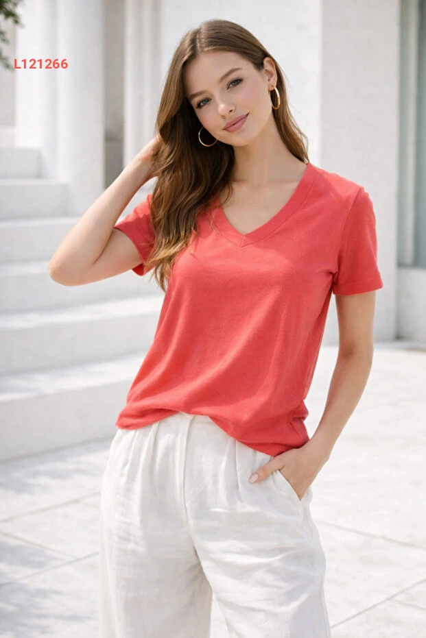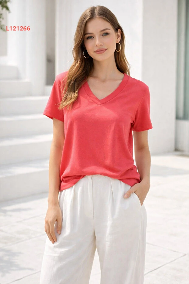 تي شيرت نسائي قميص أساسي بتصميم V عنق من قماش ناعم باللون الوردي