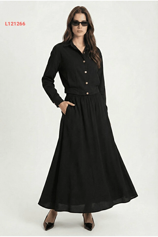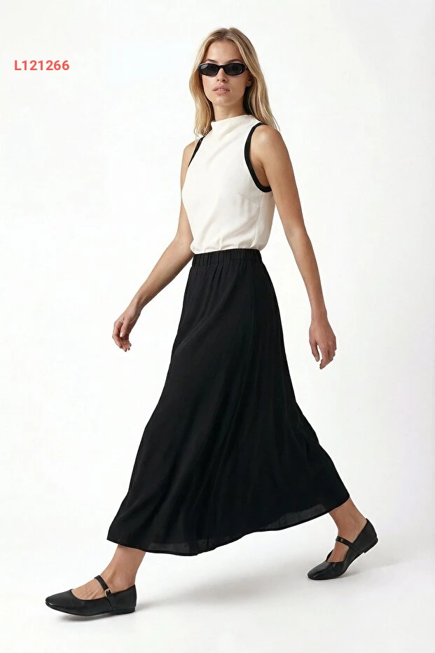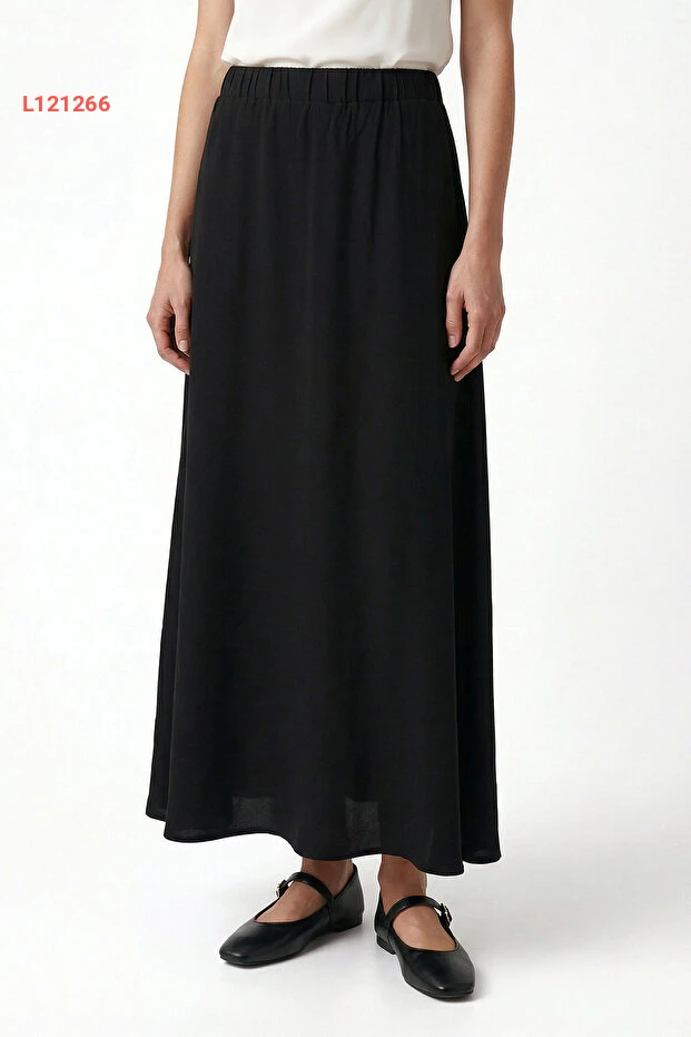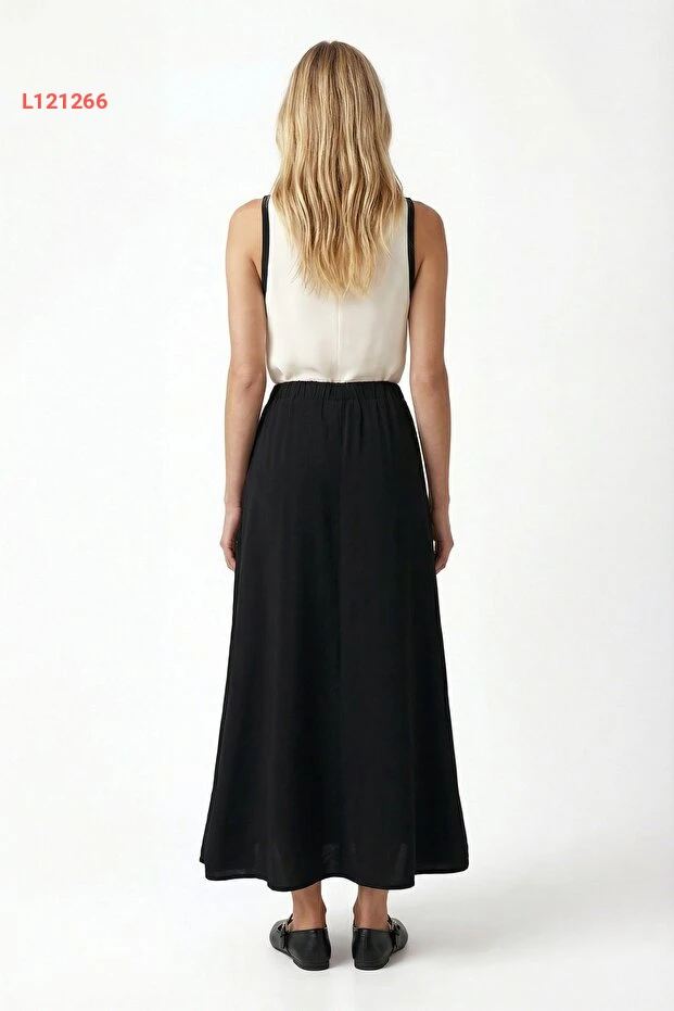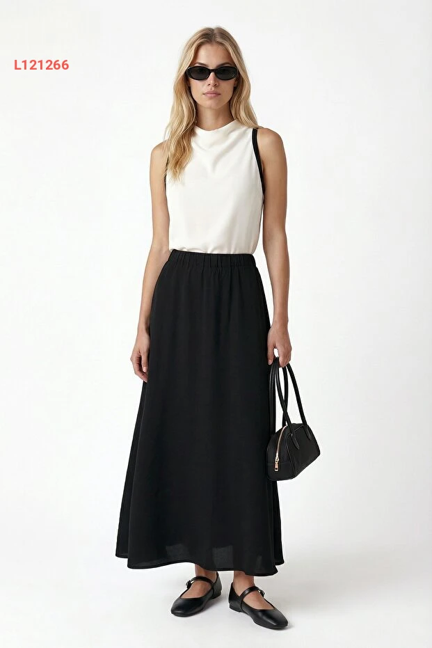 تنورة طويلة نسائية سوداء بخصر مطاطي وجيوب من ريتيانس