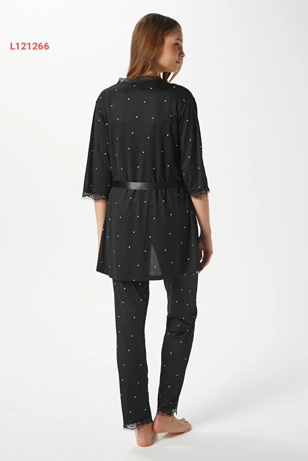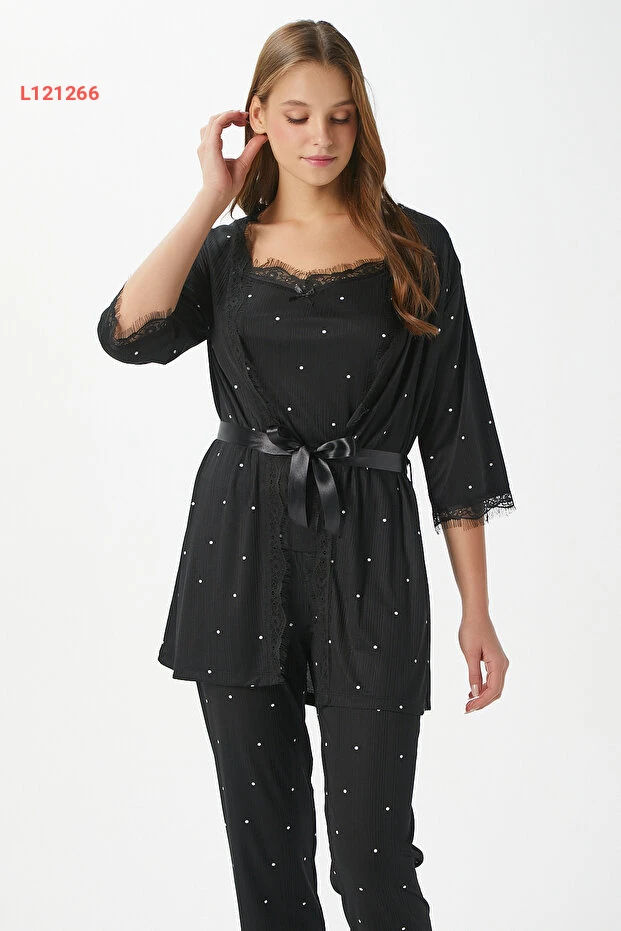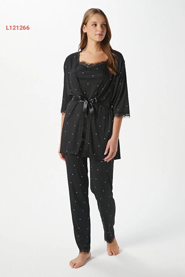 باقة بيجامة نسائية برتنية سوداء مزينة بنقاط - 3 قطع مع روب وحمالات دانتيلة