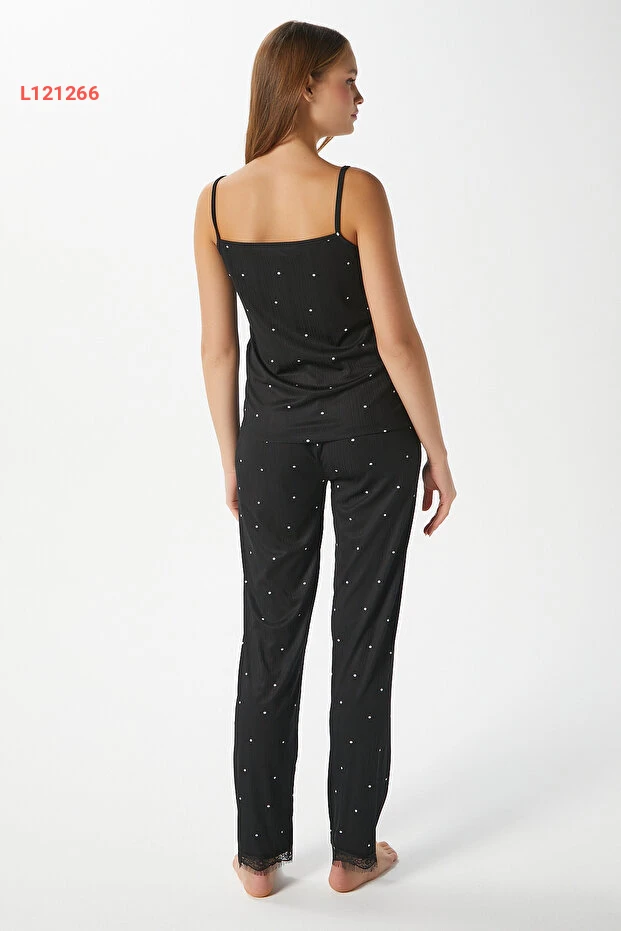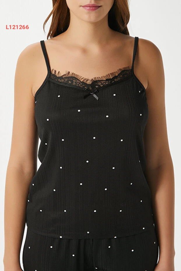 استمتع بأقصى درجات الراحة والأناقة مع طقم البيجاما المكون من 3 قطع من Ritnice. يتميز هذا الطقم بلون أسود أنيق ونقوش البولكا دوت، مع تفاصيل دانتيل رائعة وحمالات رفيعة، ليمنحك مظهراً جميلاً وشعوراً استثنائياً في كل ليلة. مثالي للاسترخاء في المنزل أو للنوم براحة مطلقة.