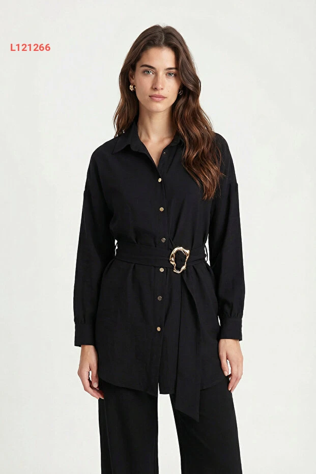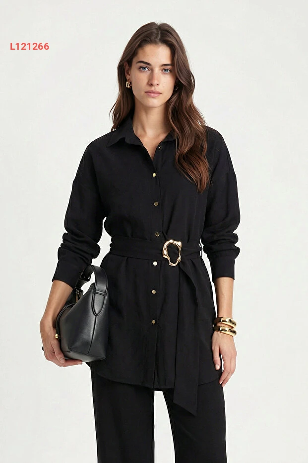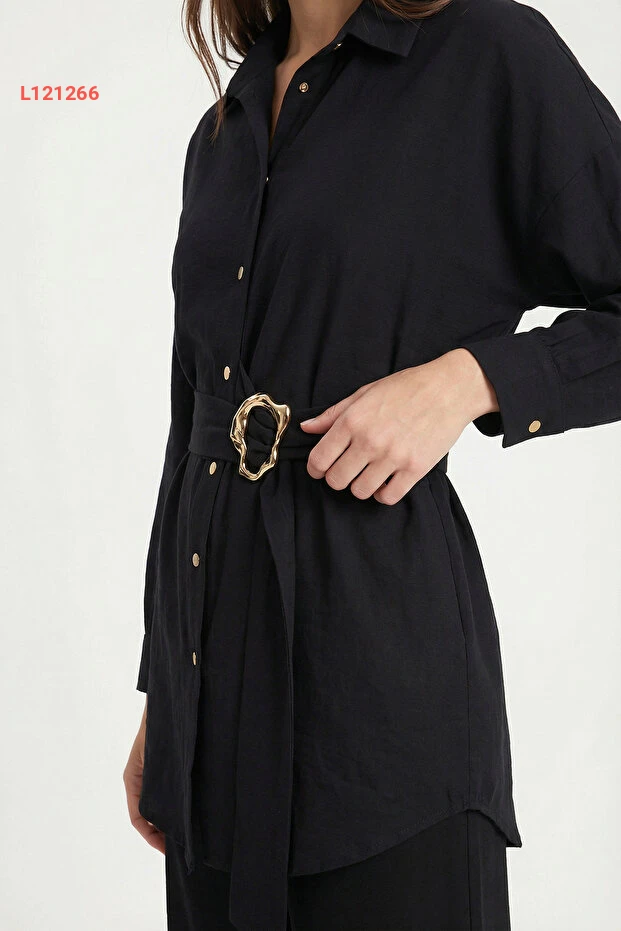 بدلة نسائية سوداء مزينة بحزام قماشي مع إبزيم ذهبي من ريتنيك