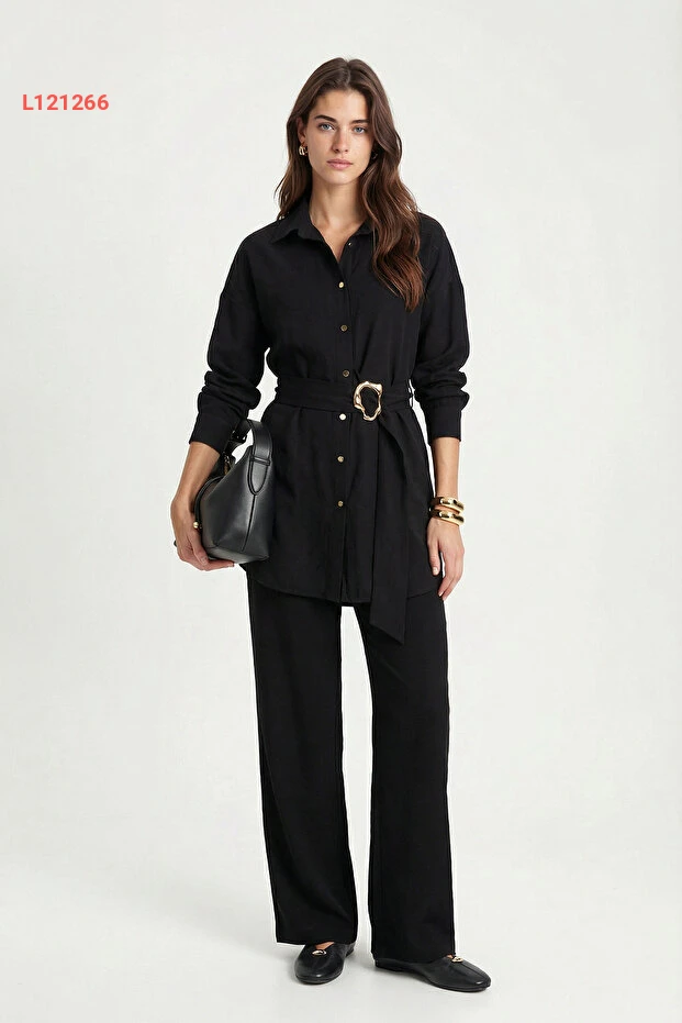 اكتشفي أناقتك مع طقم Ritnice Kadın Carmen، الذي يجمع بين الراحة والموضة في تصميم رائع. يتميز هذا الطقم الأسود الأنيق بزاوية ذهبيّة توك تطوّق الخصر، مما يضفي لمسة من الفخامة، بينما يوفر لك القماش المنسوج المتين حرية الحركة طوال اليوم، مثاليّ للارتداء اليومي أو المناسبات الخاصة.