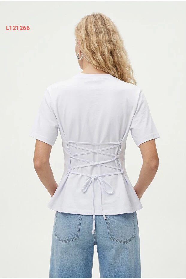 تيشيرت/بلوزة ريتنيك النسائية القابلة للتعديل من القطن الأبيض مع حزام حول الخصر