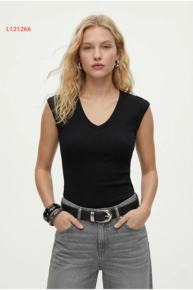 بلوزة ماريت اللمسة الفاخرة بلا أكمام بتصميم V للنساء - سوداء