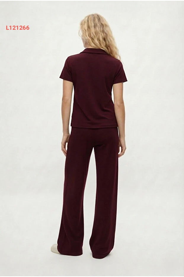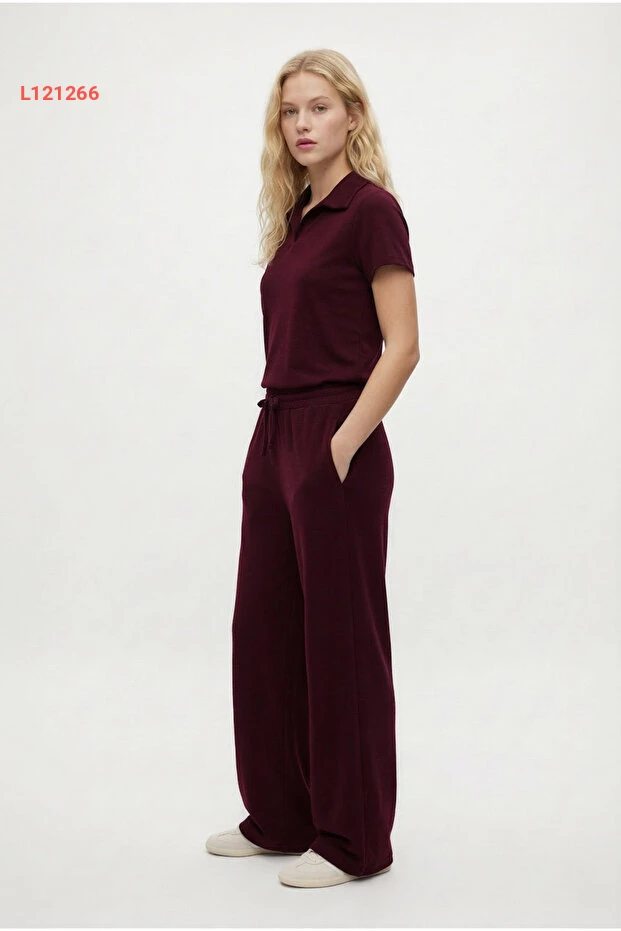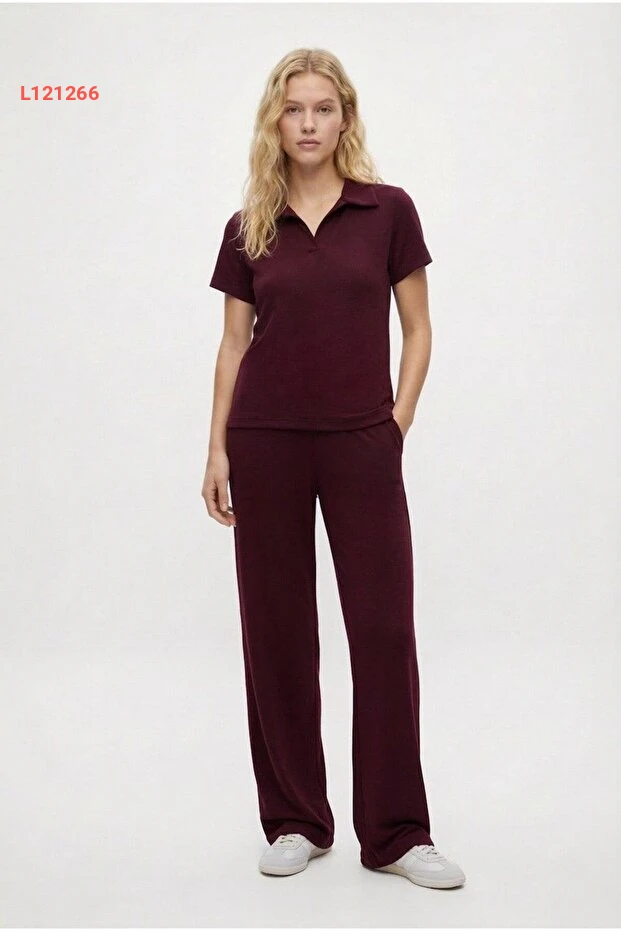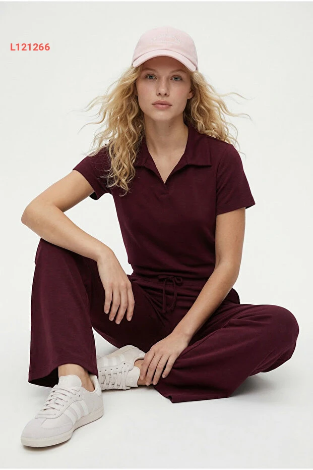 مجموعة ريتنيك نسائية بولو ياقات وخصر مطاطي جيوب بلون بورغندي