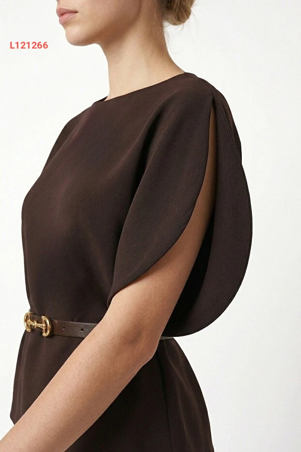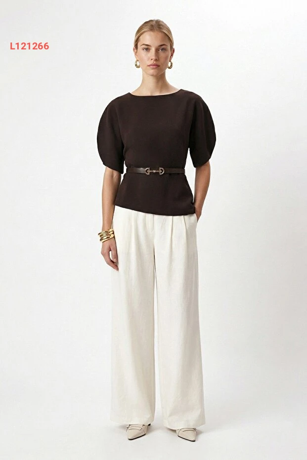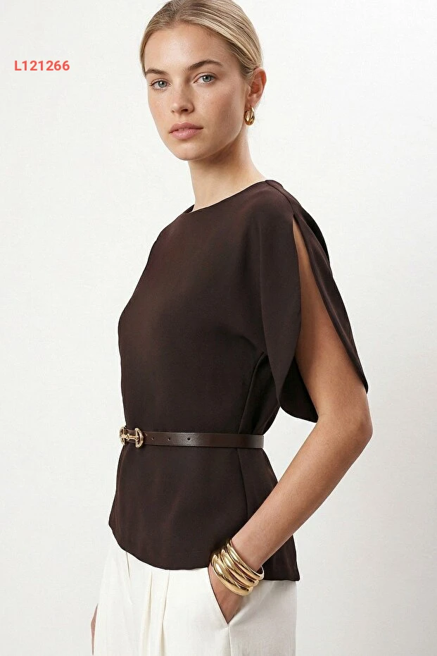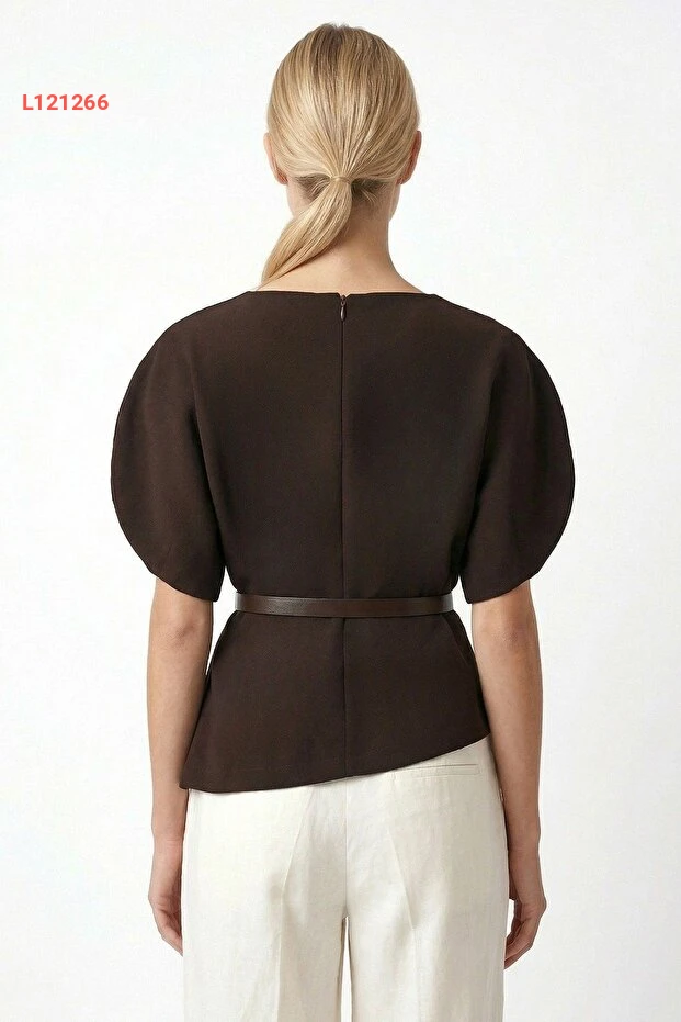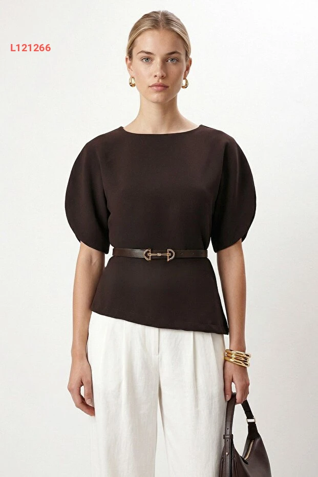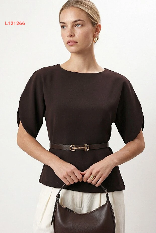 استمتعي بأناقة لا تُضاهى مع بلوزة "Ritnice" ذات الياقة الدائرية والأكتاف المنخفضة. مصنوعة من قماش توك الفاخر باللون البني، تأتي مع حزام رقيق يبرز جمال قوامك، مما يجعلها الخيار المثالي لإطلالة تجمع بين الراحة والأناقة في كل الأوقات.