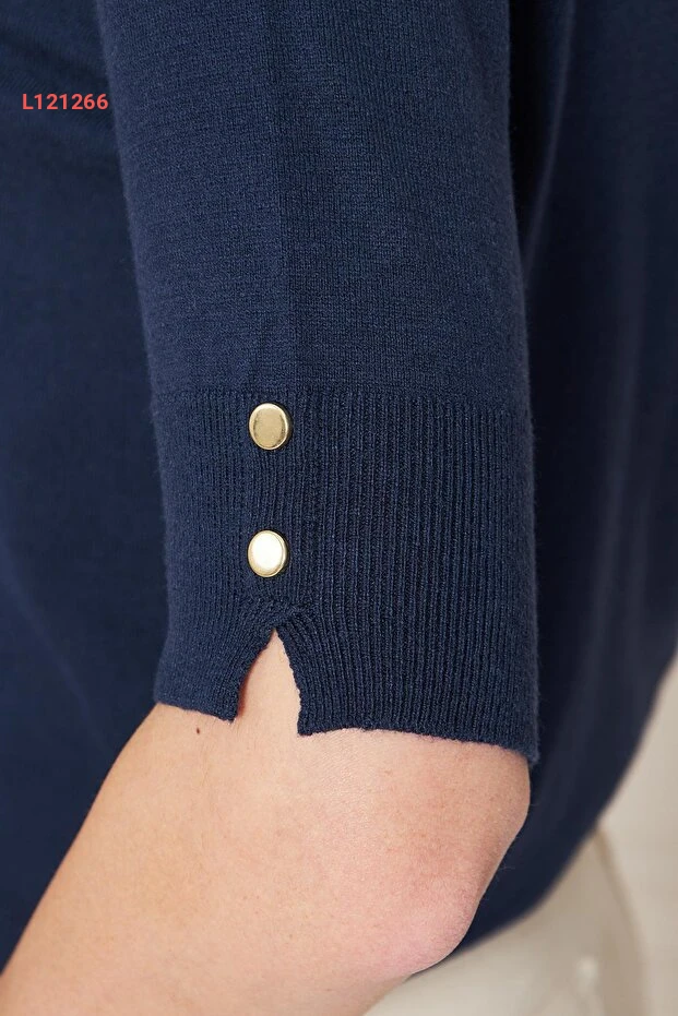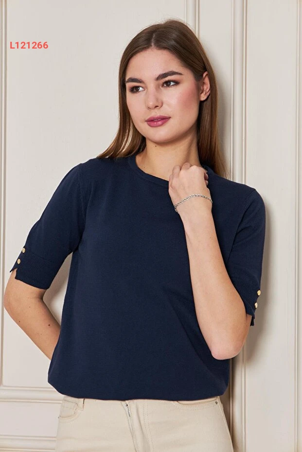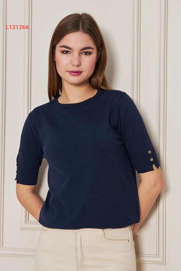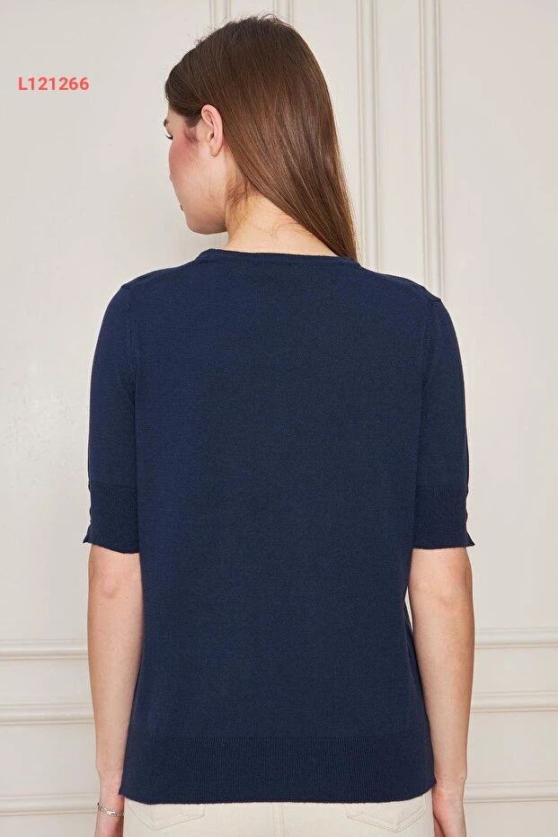 بلوزة تريكو قصيرة الأكمام برباط دائري للنساء - لون أزرق داكن