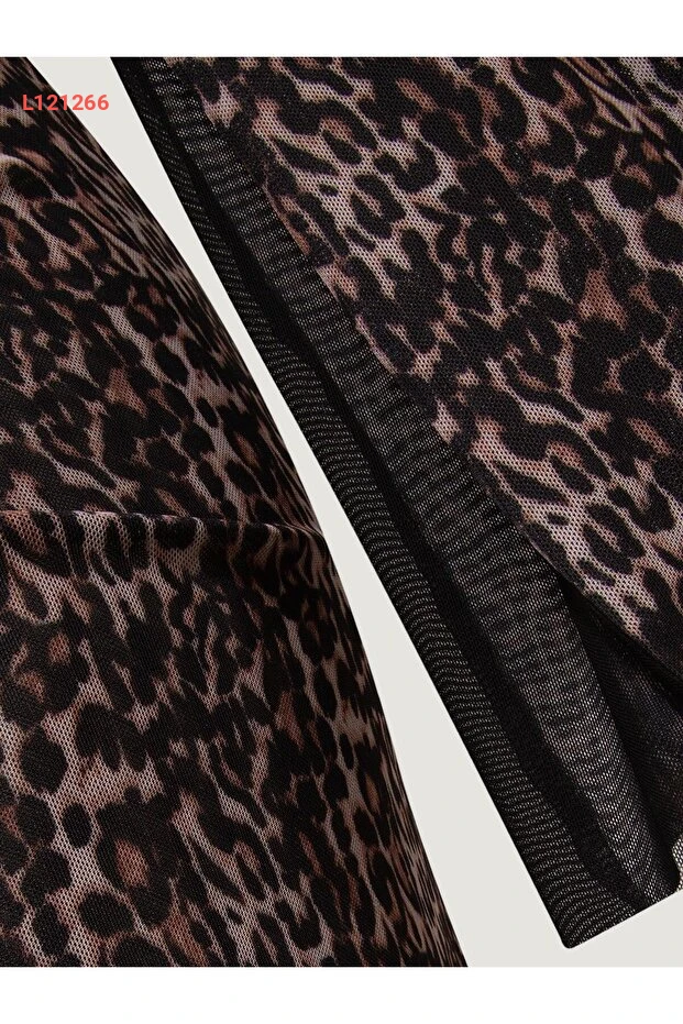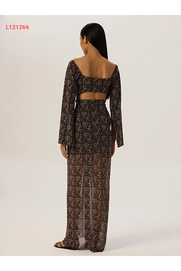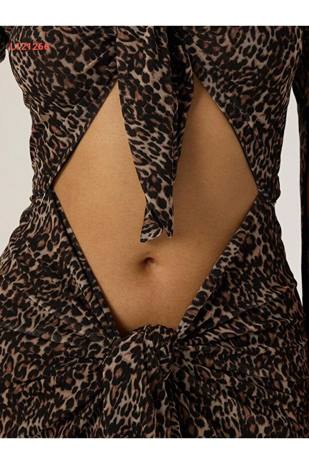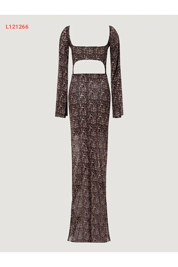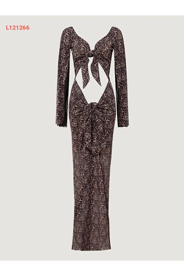 فستان طويل بتصميم ليوبارد - مزود بحزام أمامي وبجزئين