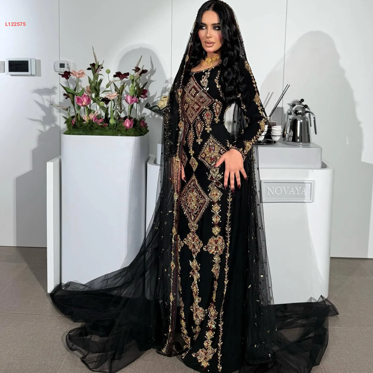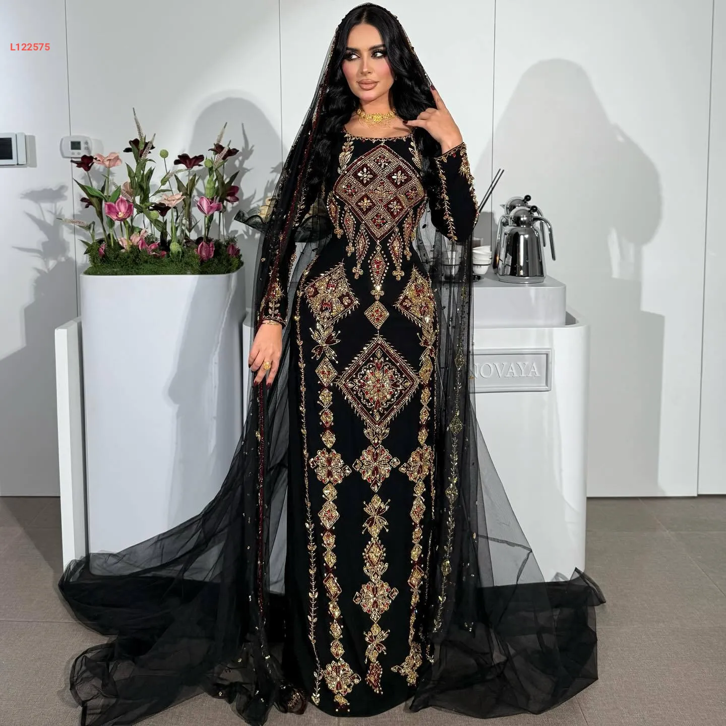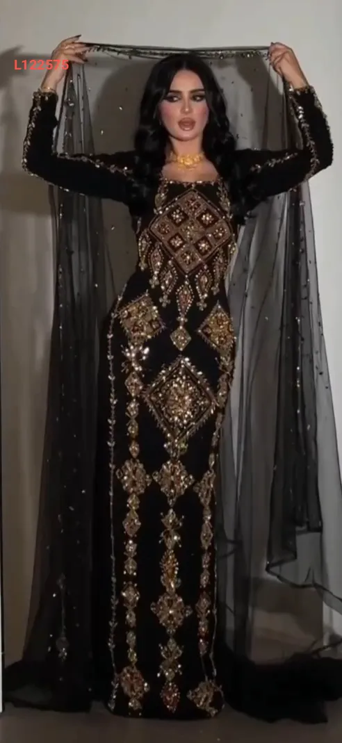 فستان سهرة ملكي مطرز مع مشلح تول