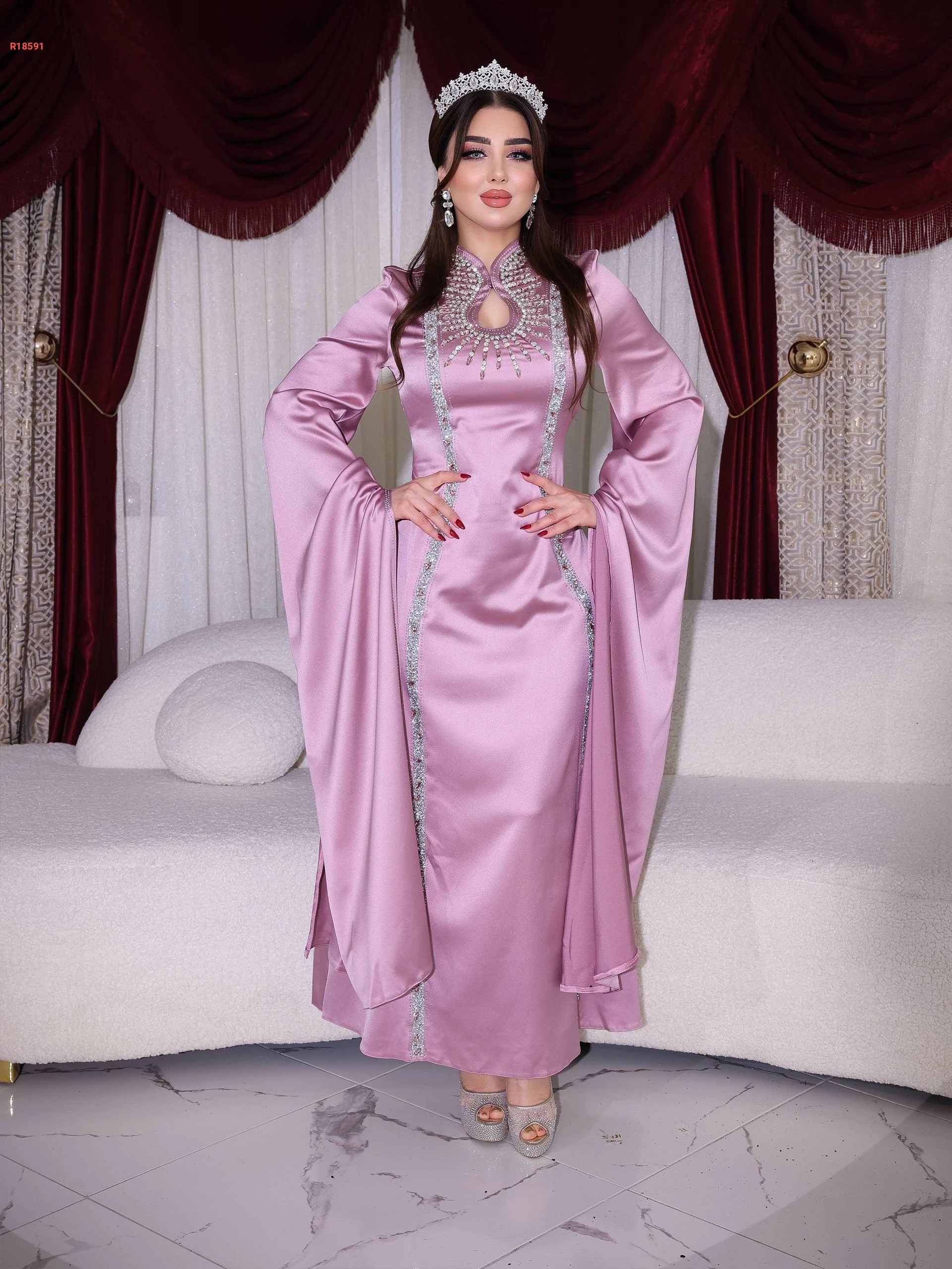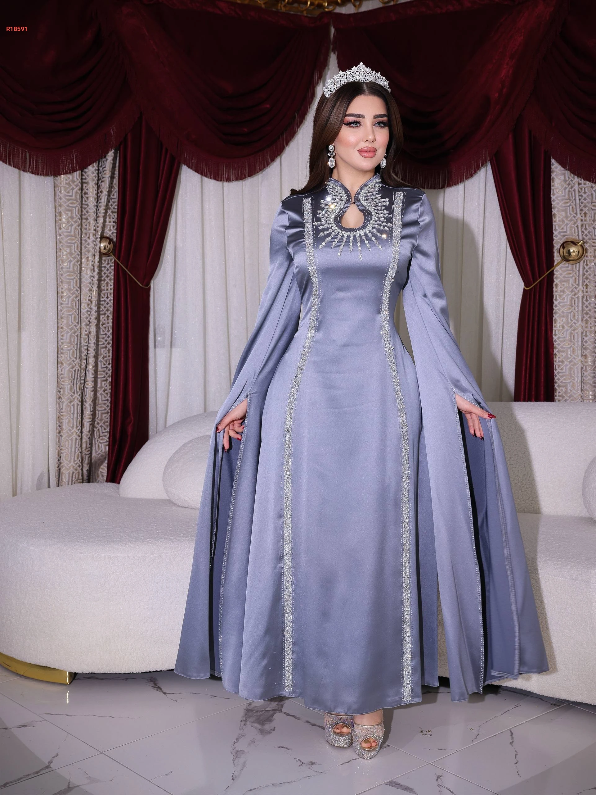 فستان سواريه ملكي كم طويل خصر قابل للتعديل بياقة مرتفعة مرصع بالألماس و الكريستال عند الصدر و الأكمام