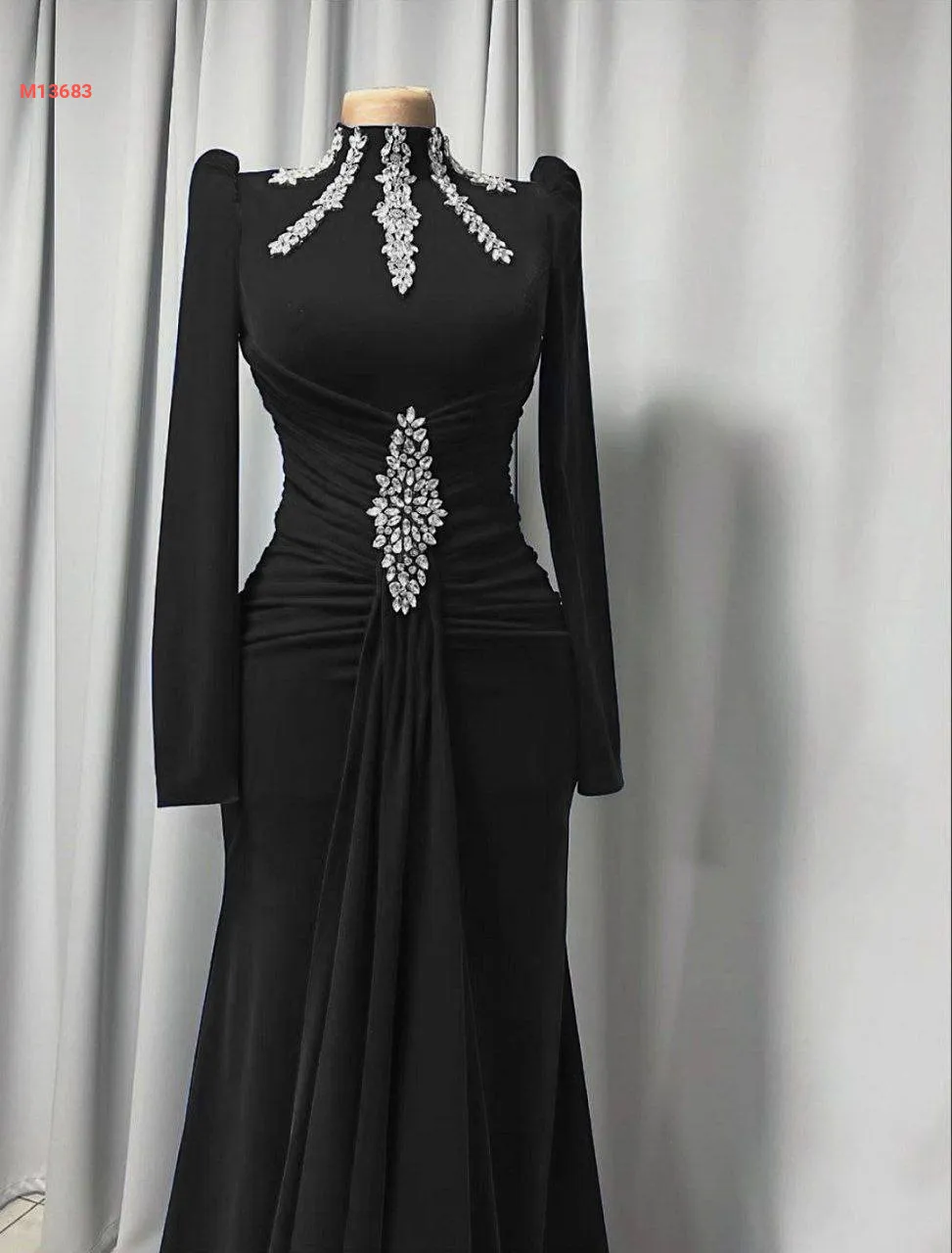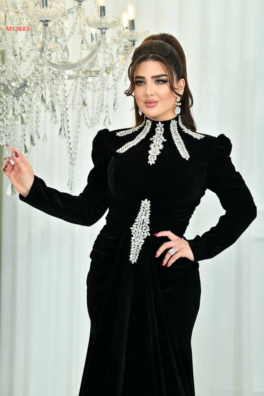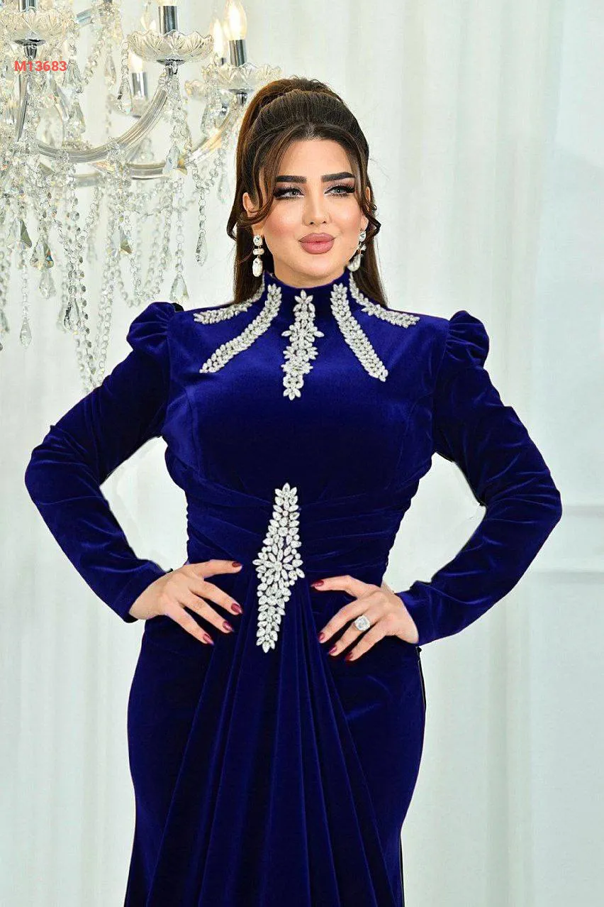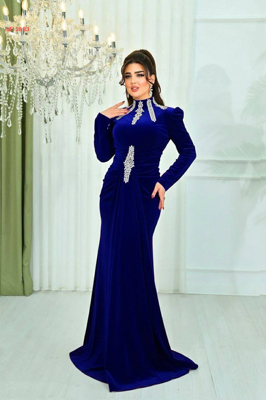 فستان ملكي مخمل ياقة مدورة مرصعة بالكريستال مع حزام مرصع بالكريستال