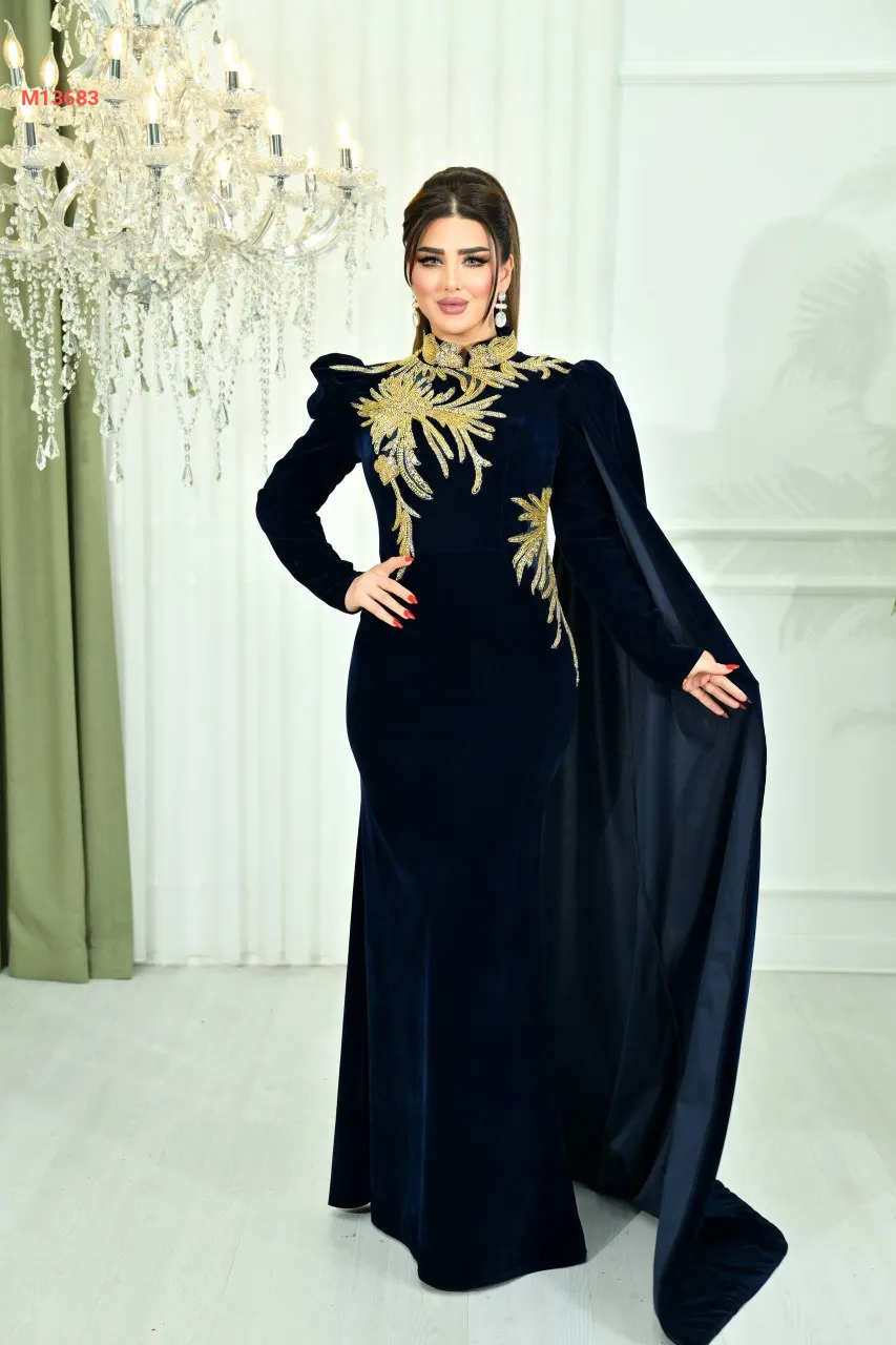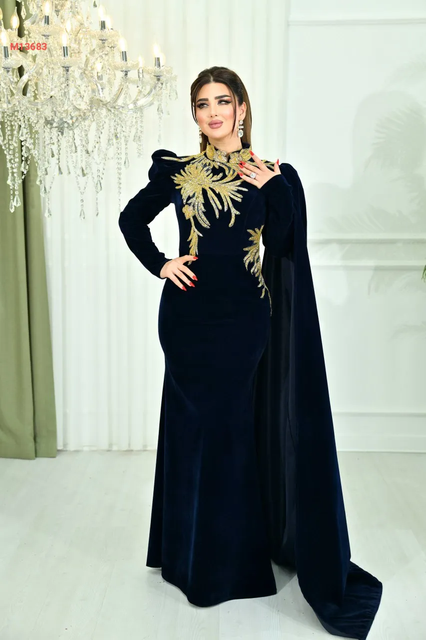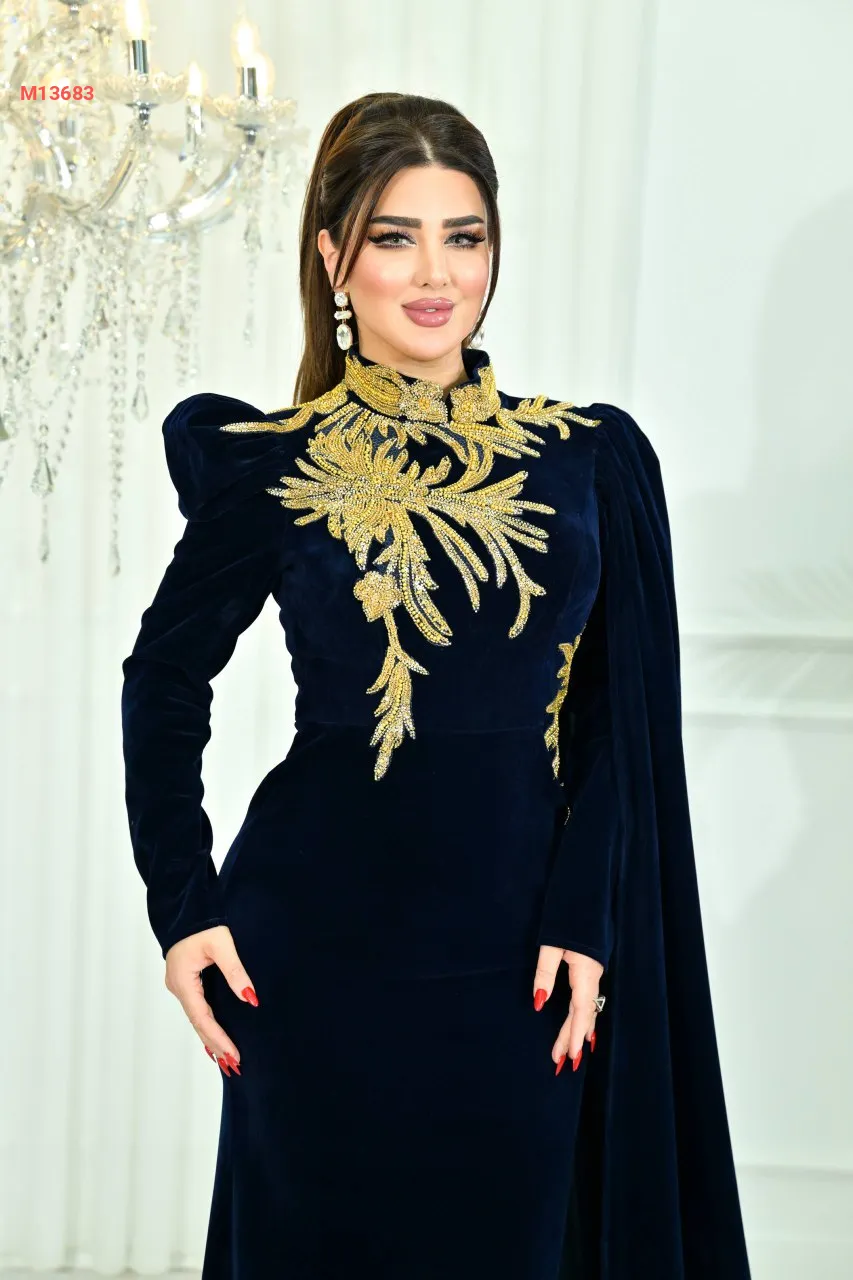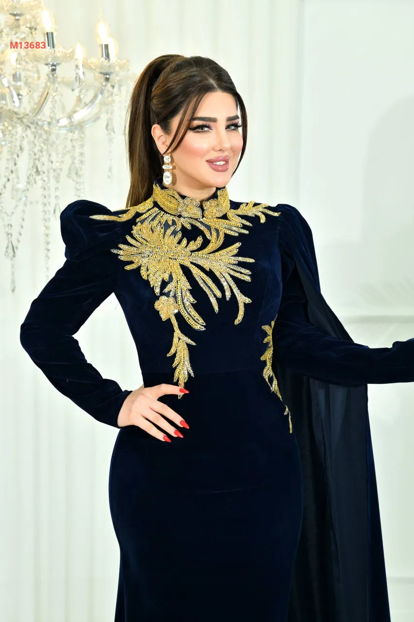 فستان سهرة مخمل ملكي مع شاحط مطرز بالشك الذهبي عند الصدر