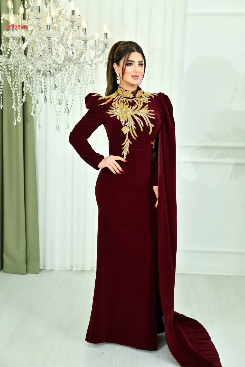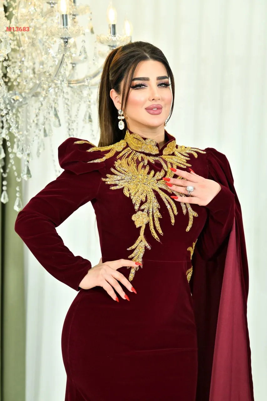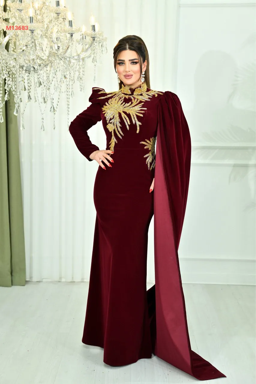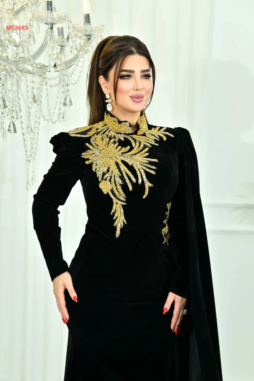 فستان سهرة مخمل ملكي مع شاحط مطرز بالشك الذهبي عند الصدر
