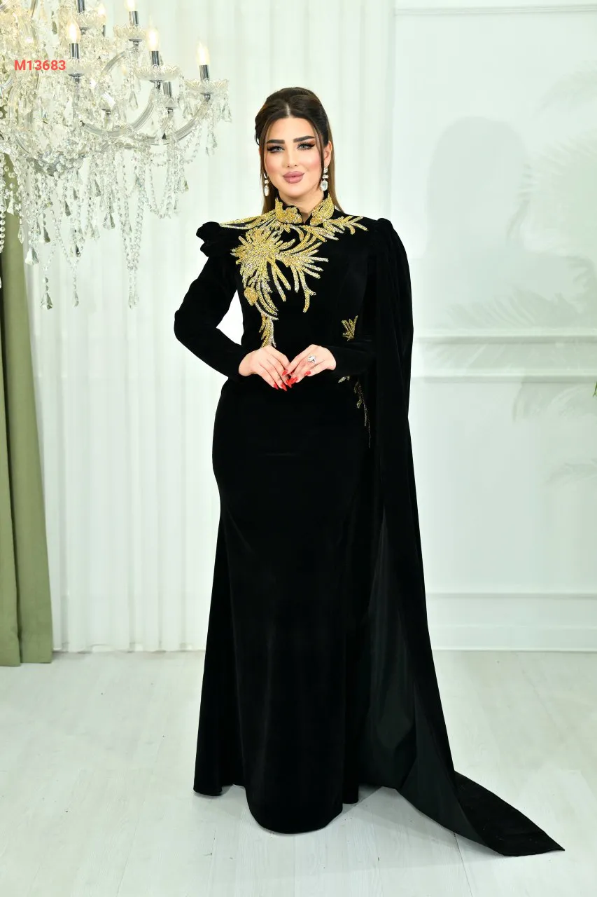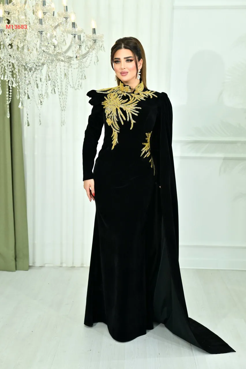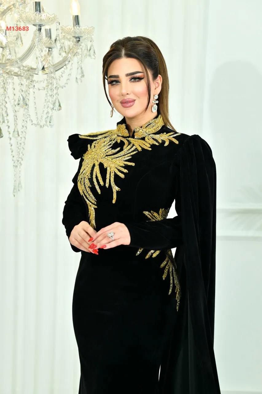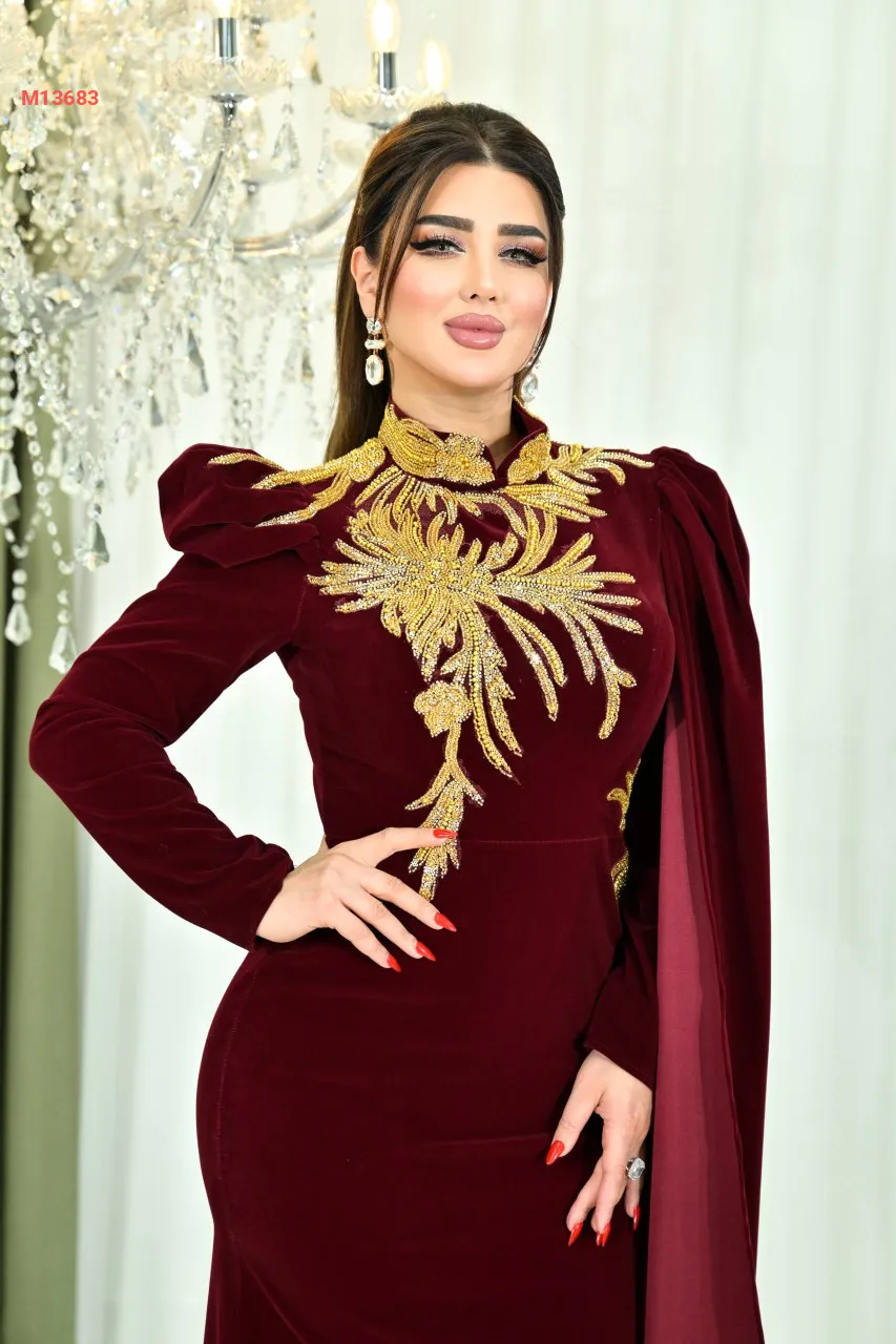 فستان سهرة مخمل ملكي مع شاحط مطرز بالشك الذهبي عند الصدر