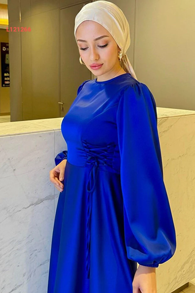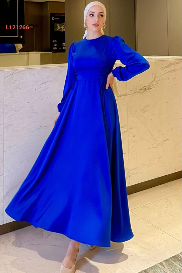 فستان سهرة ساتان مزين بالأزرار من الجانبين - أزرق ملكي
