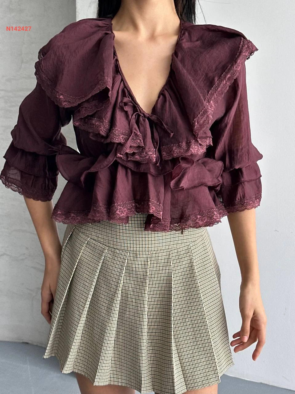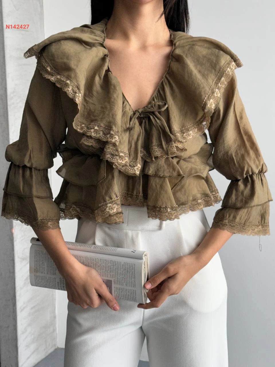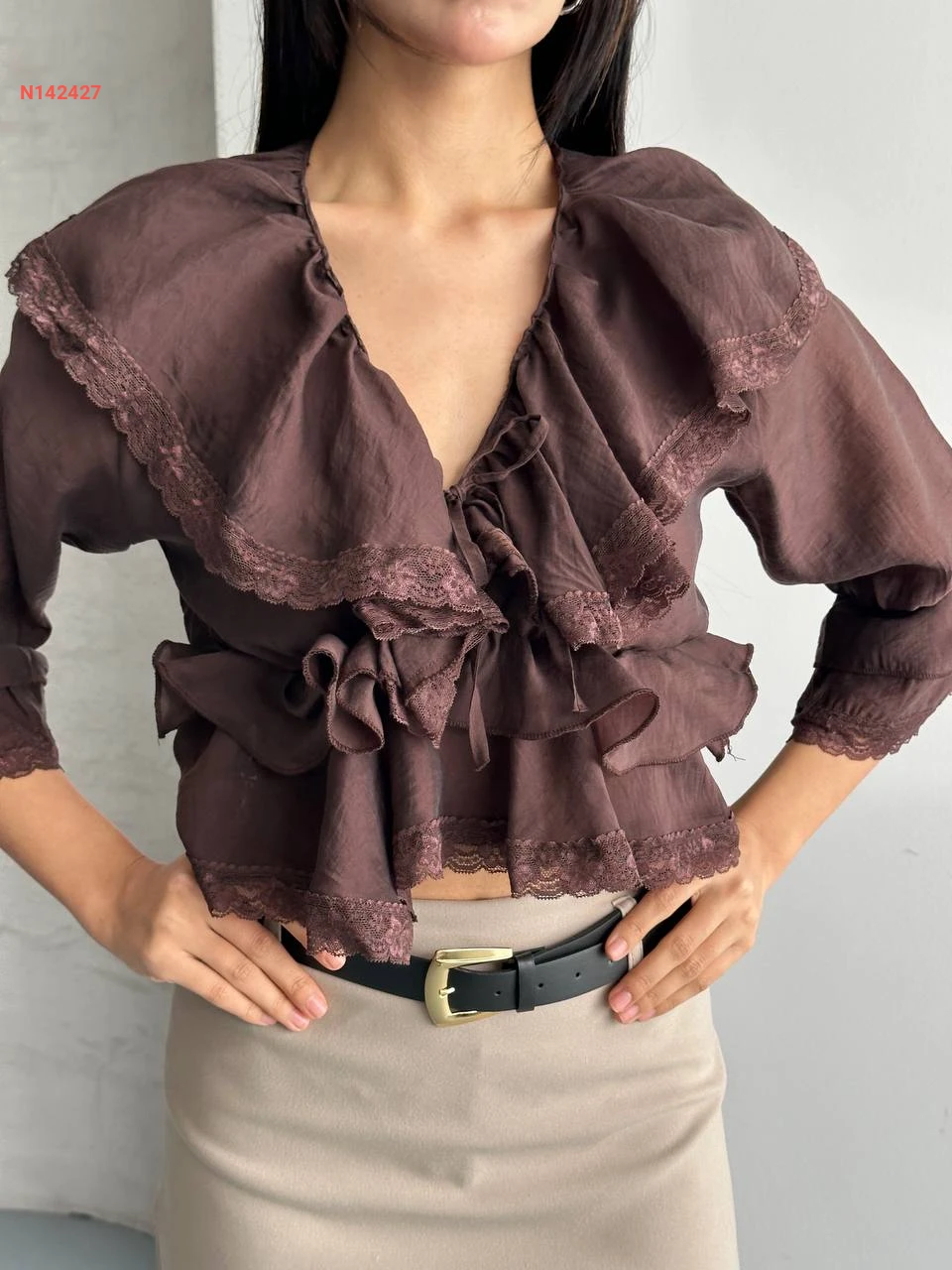 بلوزة مكشكشة بربطة مع دانتيل