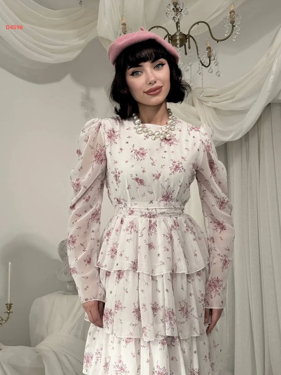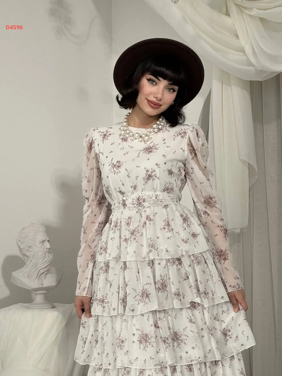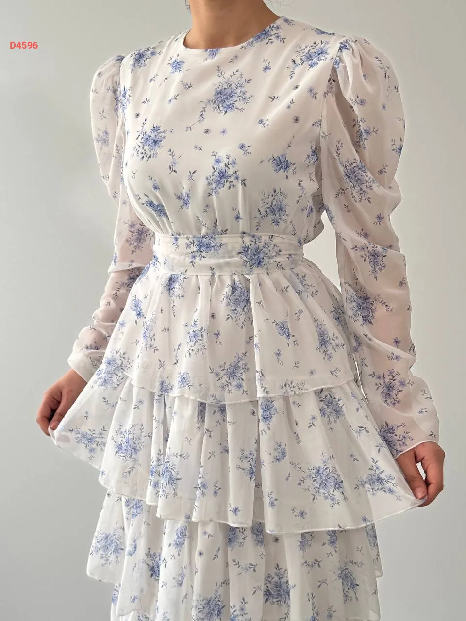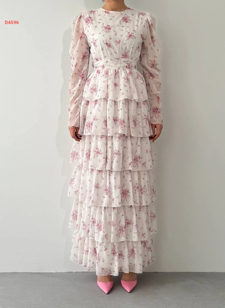 فستان طويل شيفون كشكش منقوش