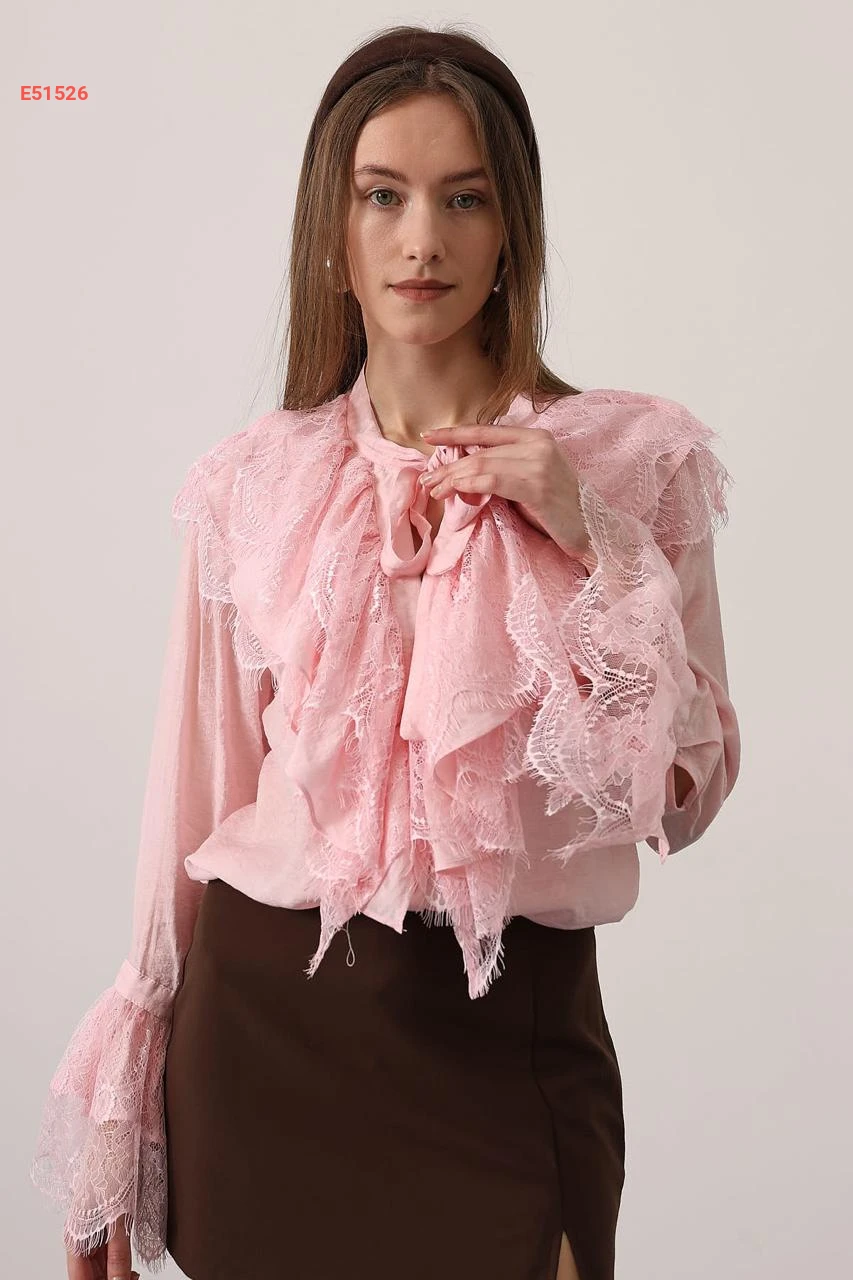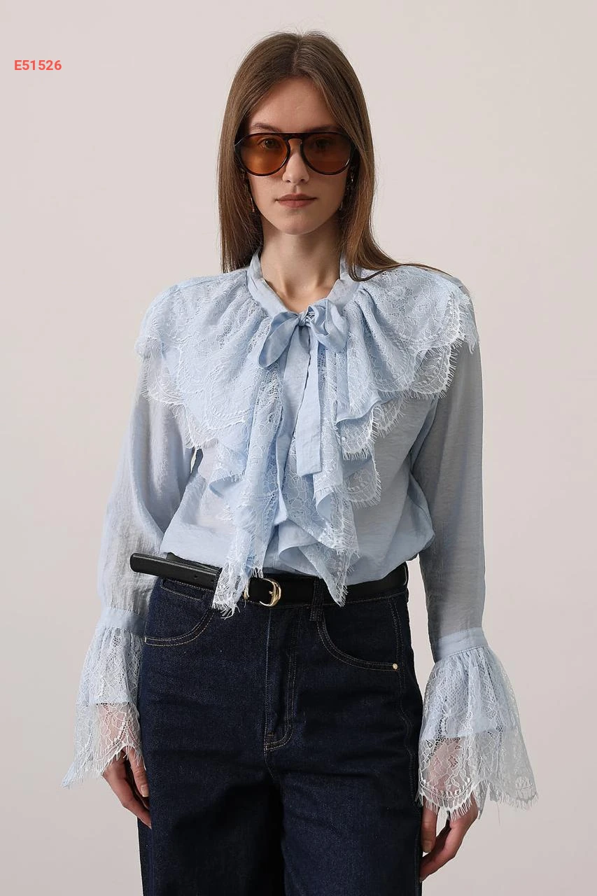 قميص مكشكش مع دانتيل وربطة عنق