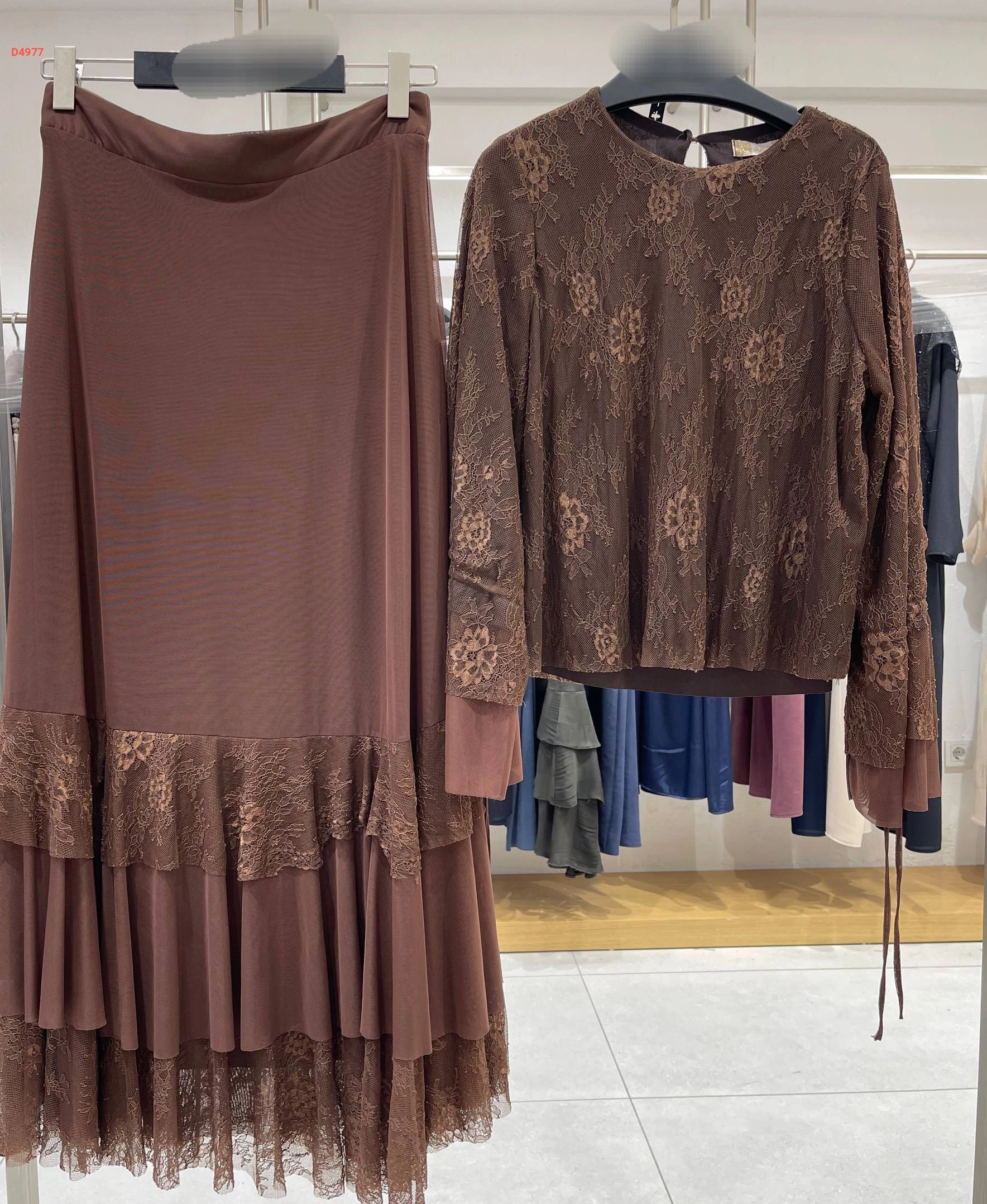 طقم تنورة كشكش مع بلوزة دانتيل مطرزة