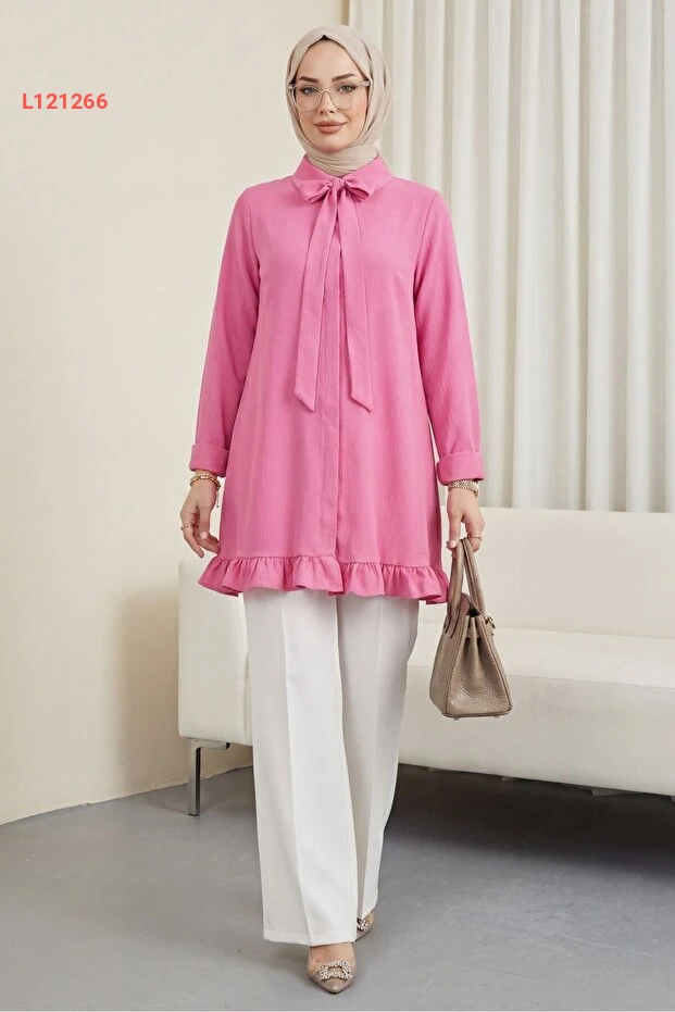 تونيك مودال وردي بتصميم مميز مع تنورة متدرجة وأربطة خفية