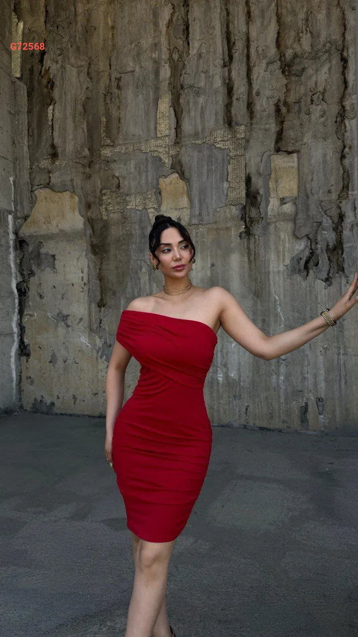 فستان ساندي قصير مجمع بكتف مكشوف